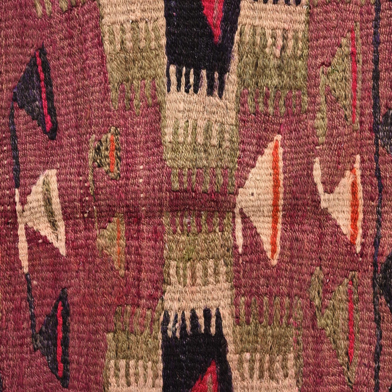 A 4x6 rectangular Kilim Fars wool rug with a vibrant tribal pattern in purples, reds, and neutrals, featuring geometric shapes and fringe.