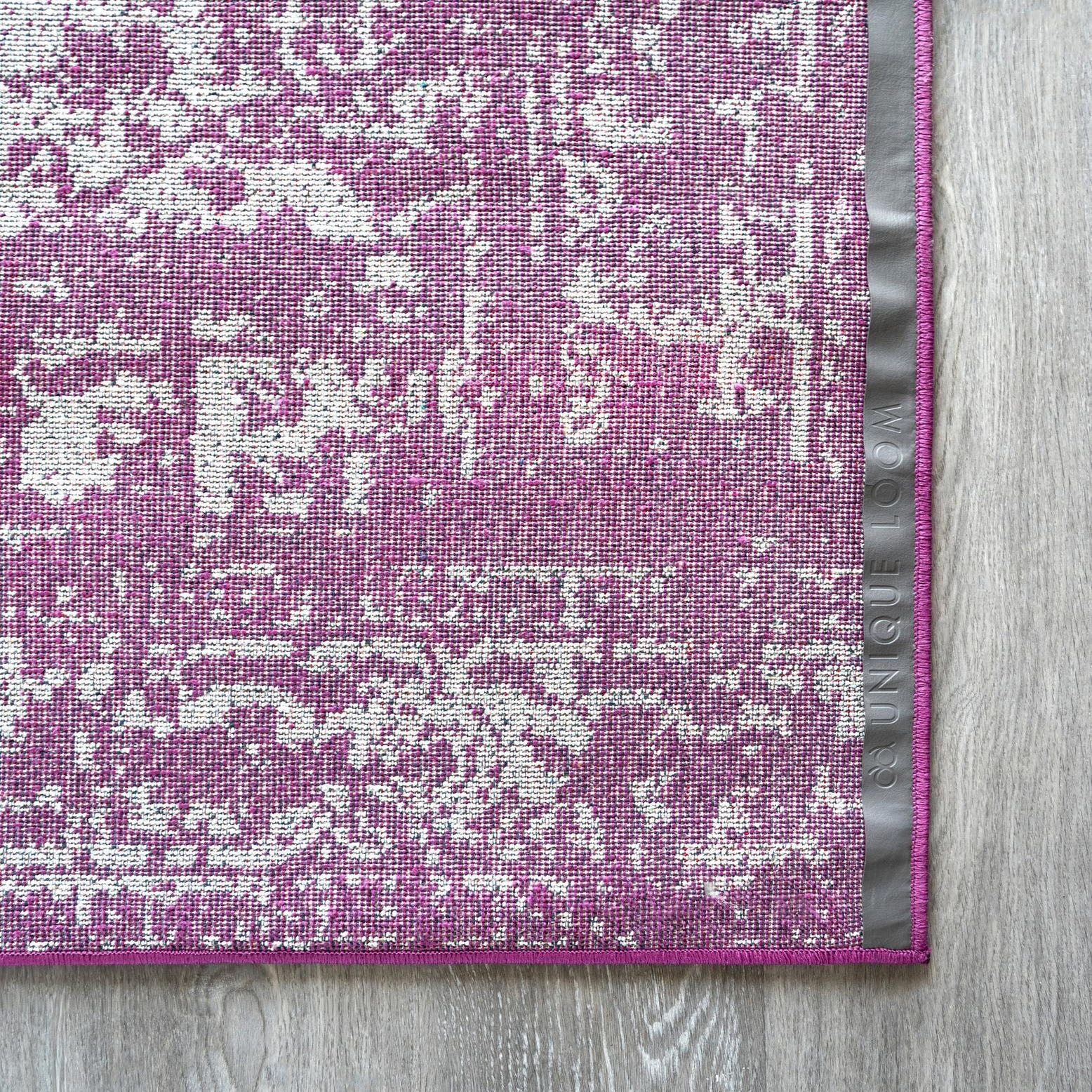 A bold purple ground sets the stage for an ornate, vintage-inspired medallion rendered in ivory. The pattern mixes classic floral and geometric motifs with a distressed overlay that softens the edges and gives the design a timeworn look. Machine-made of 100% polypropylene, the rug has a low-profile pile that feels soft underfoot while preserving the crisp contrast between the purple background and the ivory pattern.