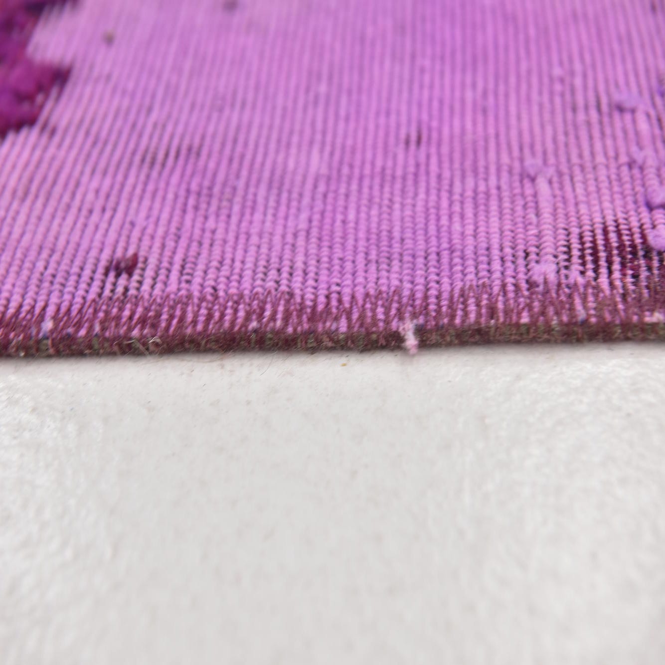 A 4' 6 x 5' 6 square purple wool rug with a distressed, abstract Persian pattern, featuring deep fuchsia and lighter lavender tones.