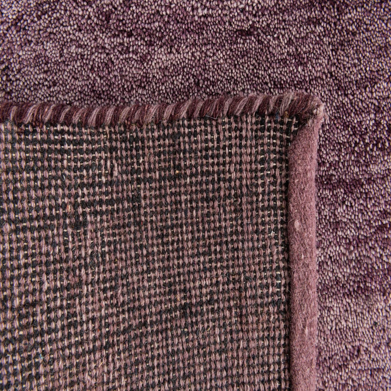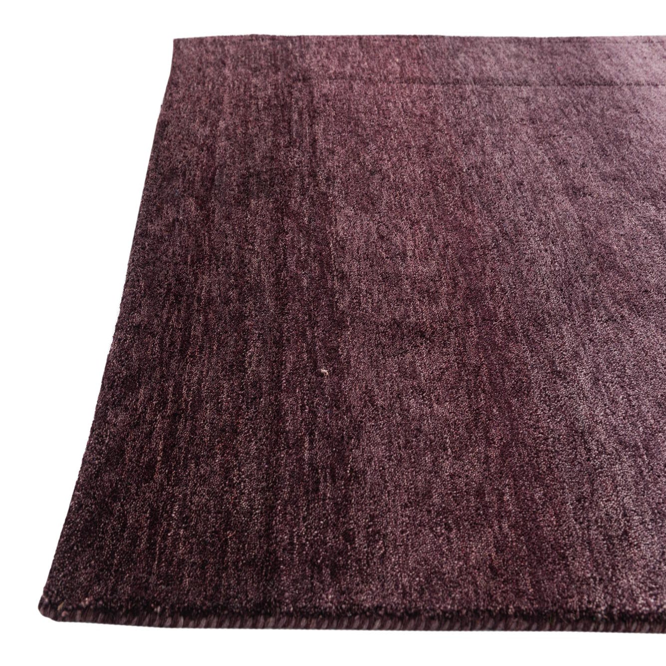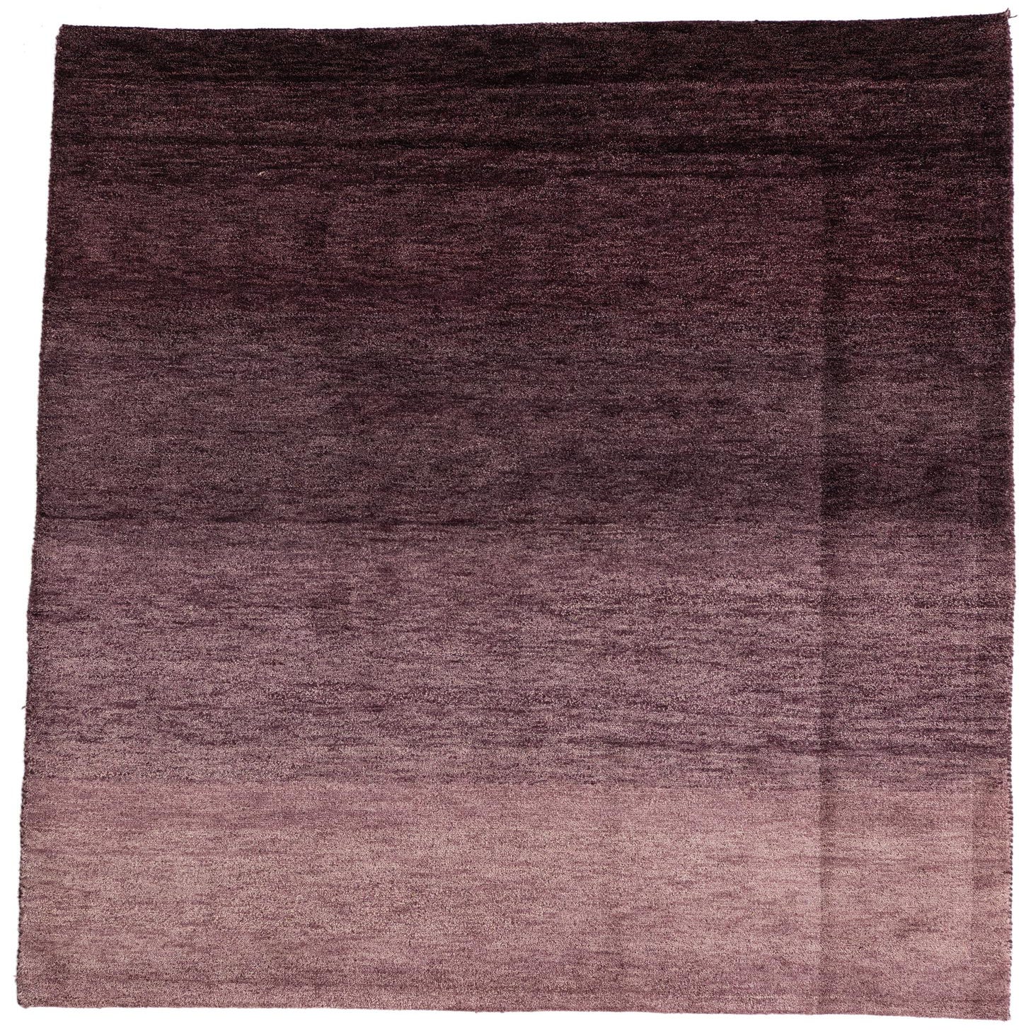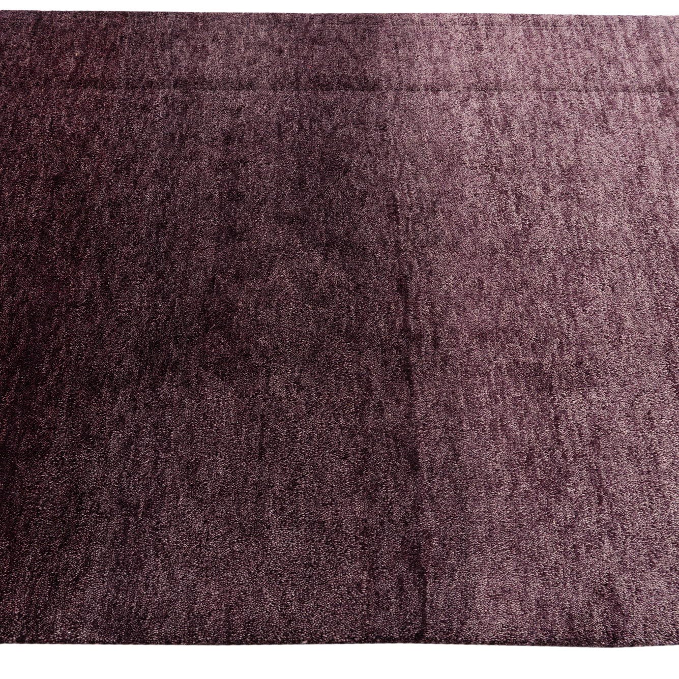 Hand-knotted with a 100% wool pile, this rug presents a calm, modern look built from color and texture rather than pattern. The field is a deep purple that graduates into softer violet tones, forming a gentle ombré that draws the eye across the surface. Narrow tonal lines form a soft, rectangular frame that adds quiet structure while keeping the overall design minimal. Run your hand over the pile and you’ll notice a dense, velvety feel with subtle variations typical of hand-knotting, giving the surface depth and a warm, tactile quality.