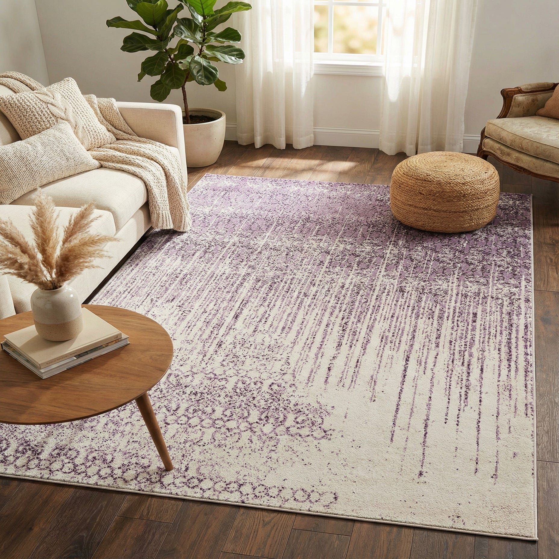 A soft purple field sets the stage for a modern, distressed pattern that blends vintage motifs with contemporary linear detail. Faded violet medallions and subtle ivory highlights emerge from the background and dissolve into vertical streaks, creating an ombré effect that feels intentional and relaxed. The design balances ornament and open space, giving the rug a layered, lived-in look without heavy contrast.