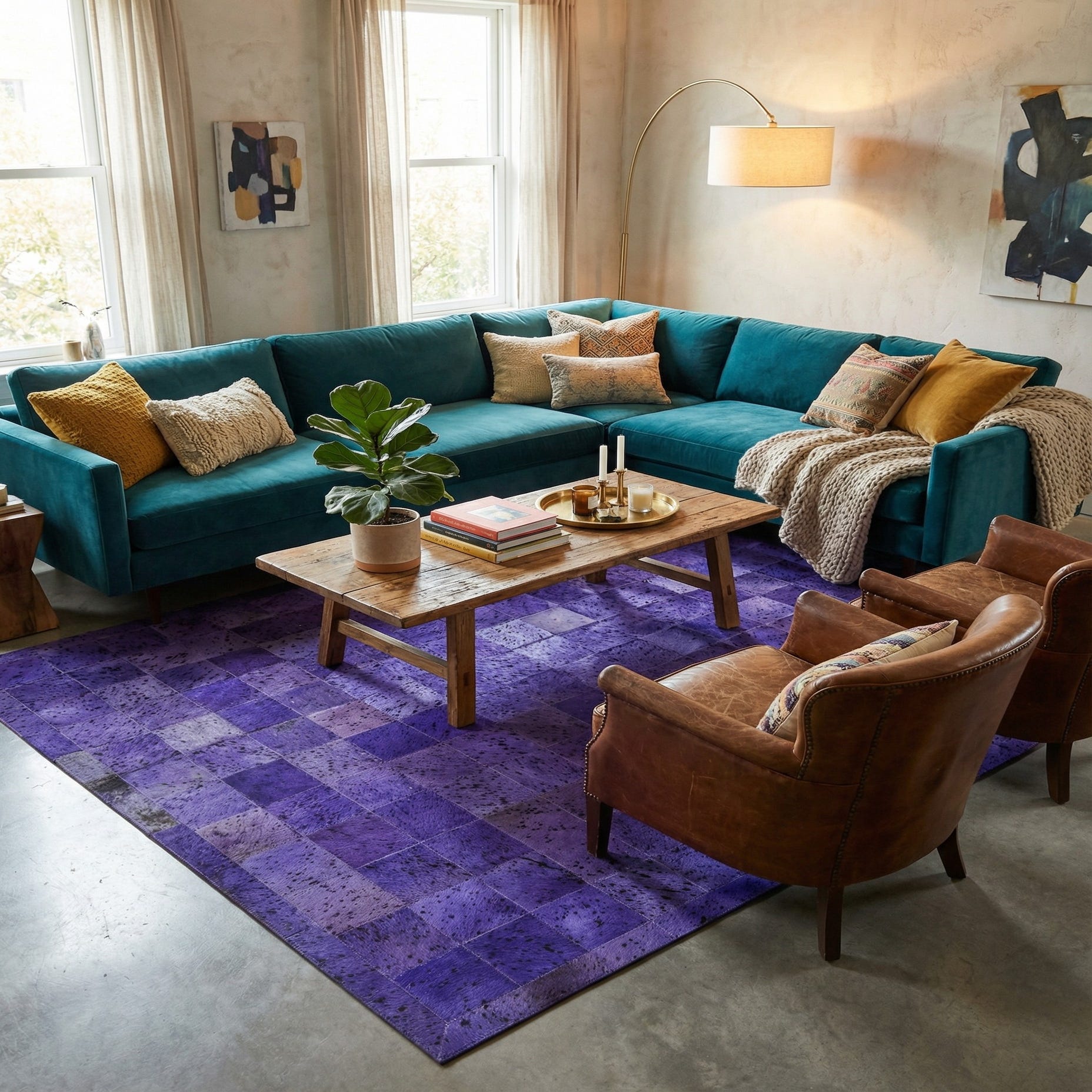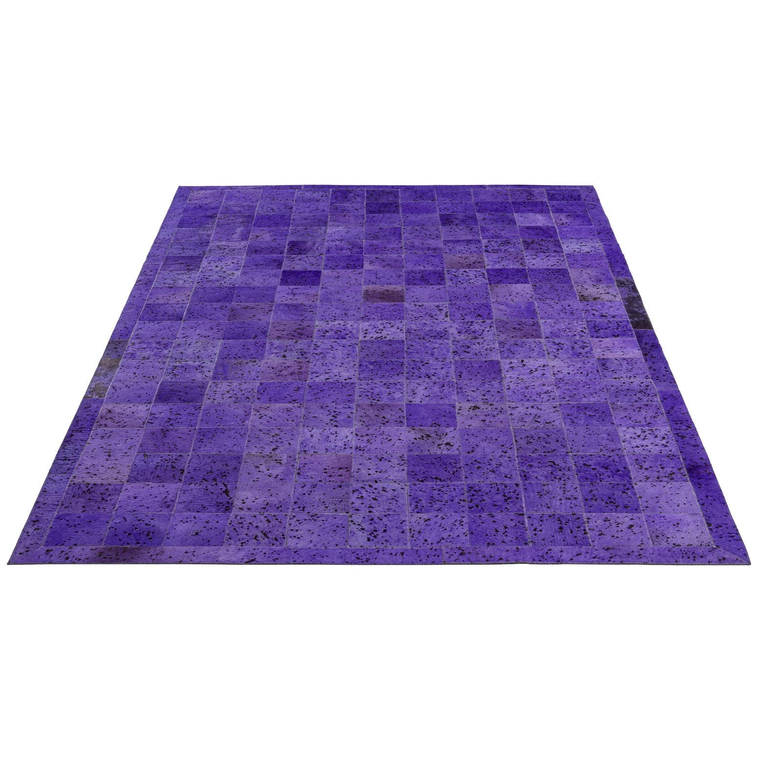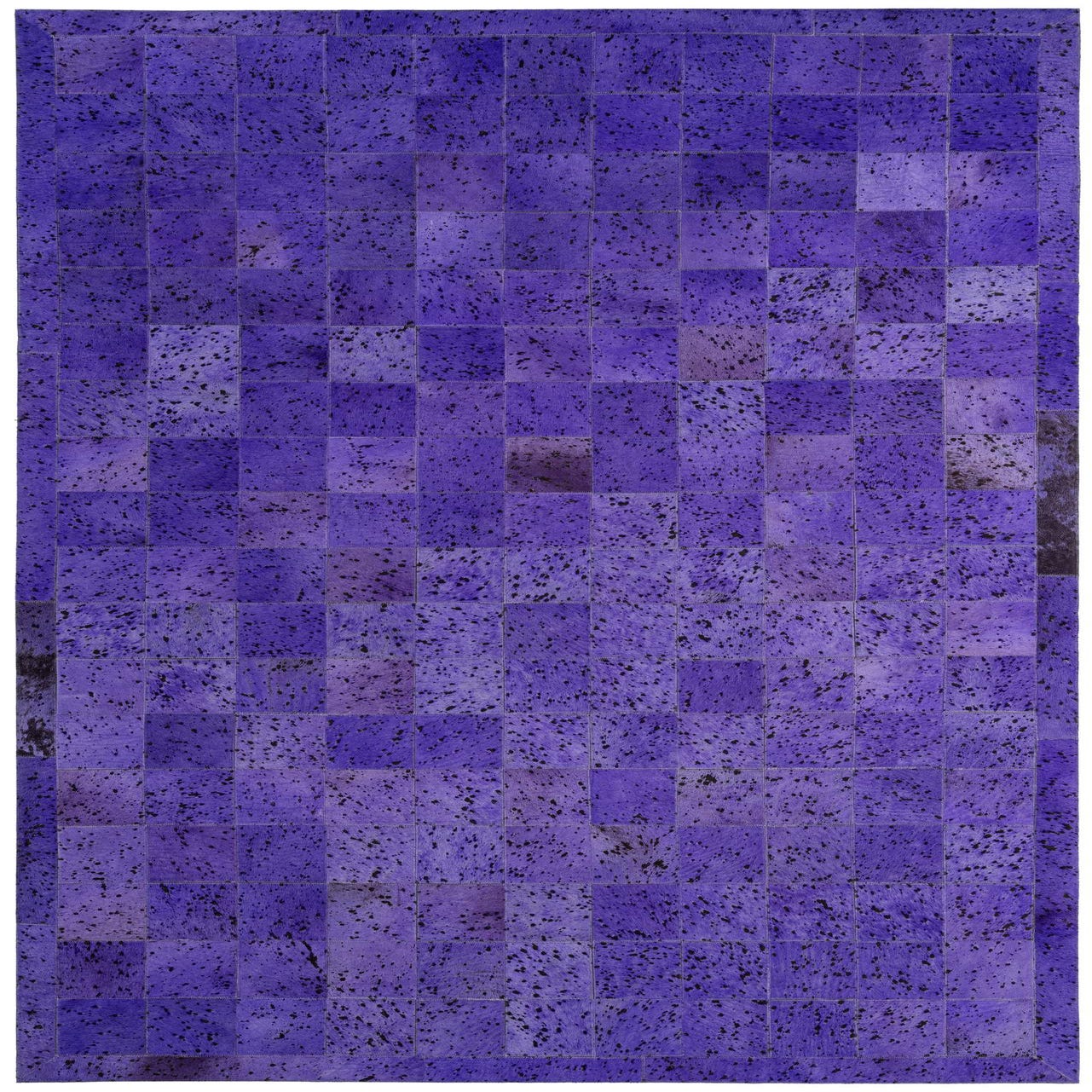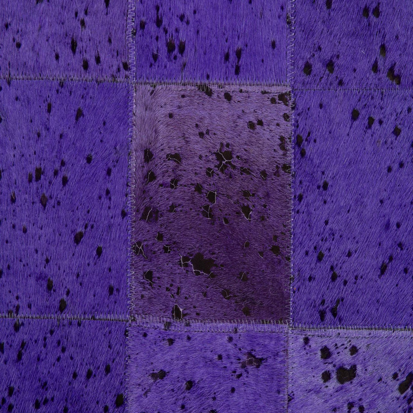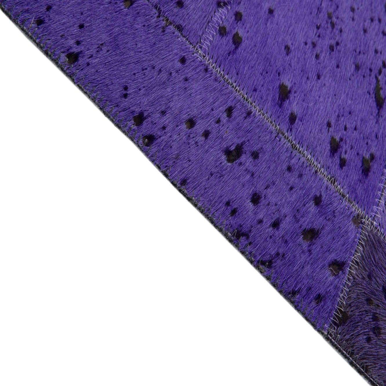 A 5x8 rectangular Cowhide - Patchwork rug in varying shades of purple with dark speckles, featuring a modern, abstract design.
