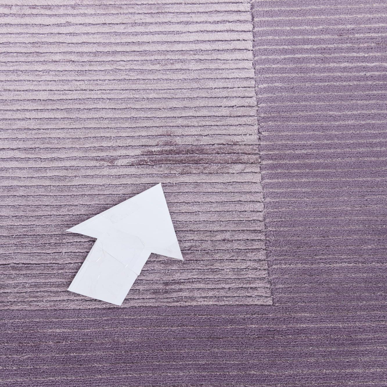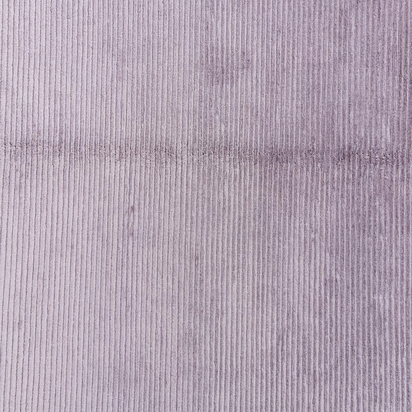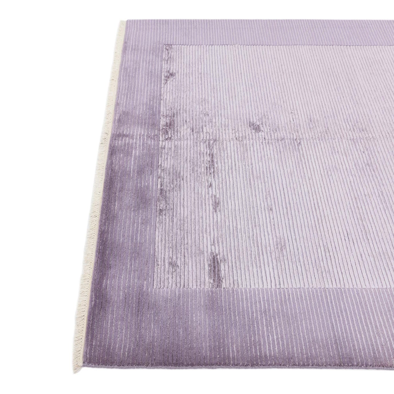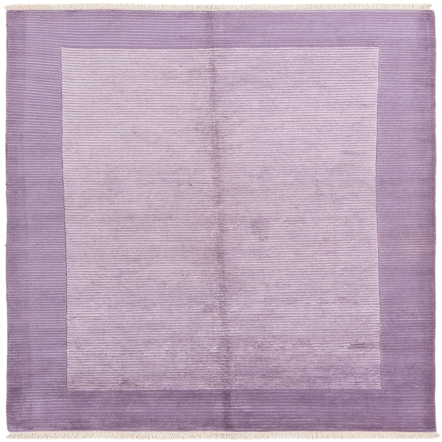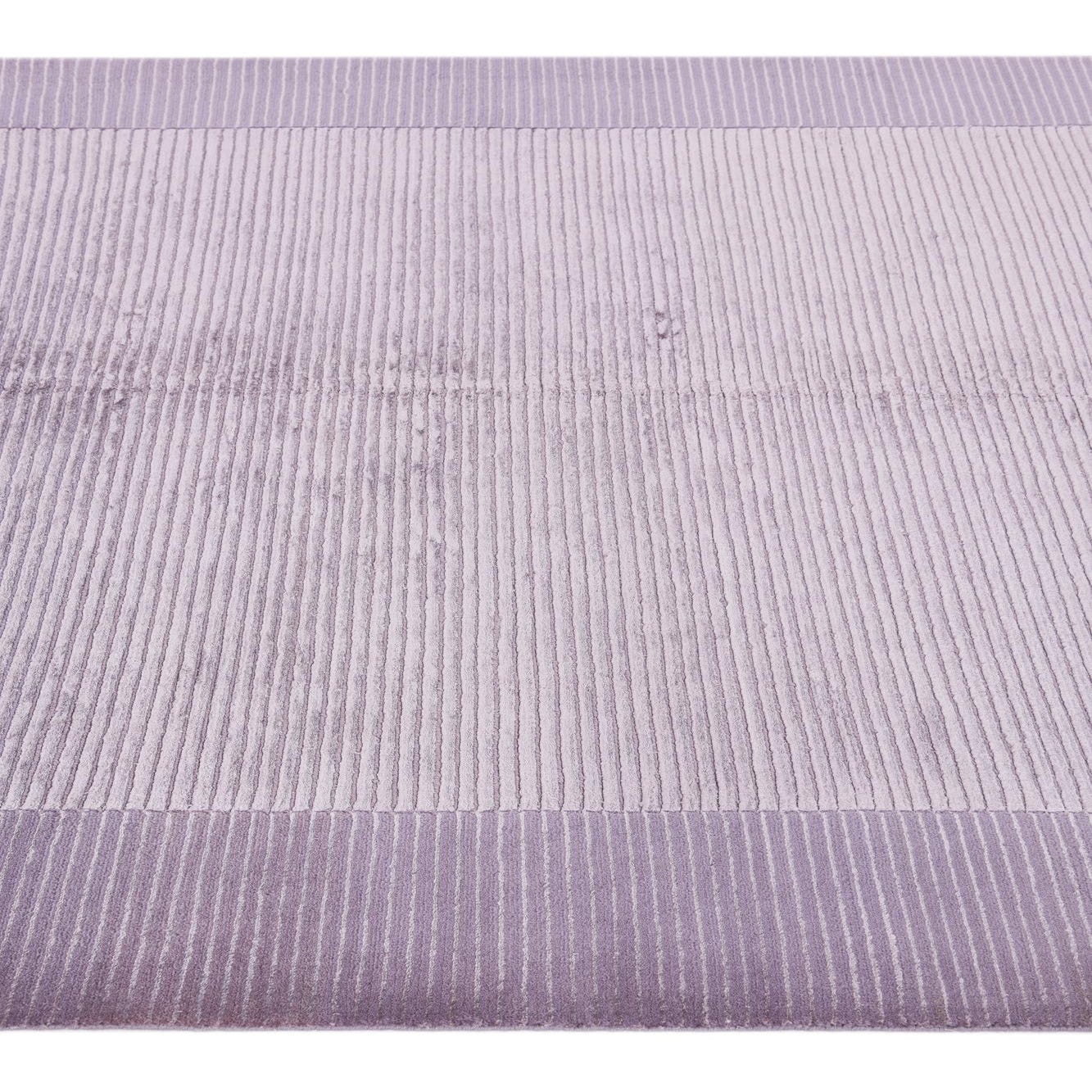 A 5x8 rectangular purple wool area rug featuring a modern oriental design with a lighter purple center and a darker purple border, both with horizontal ribbed textures.