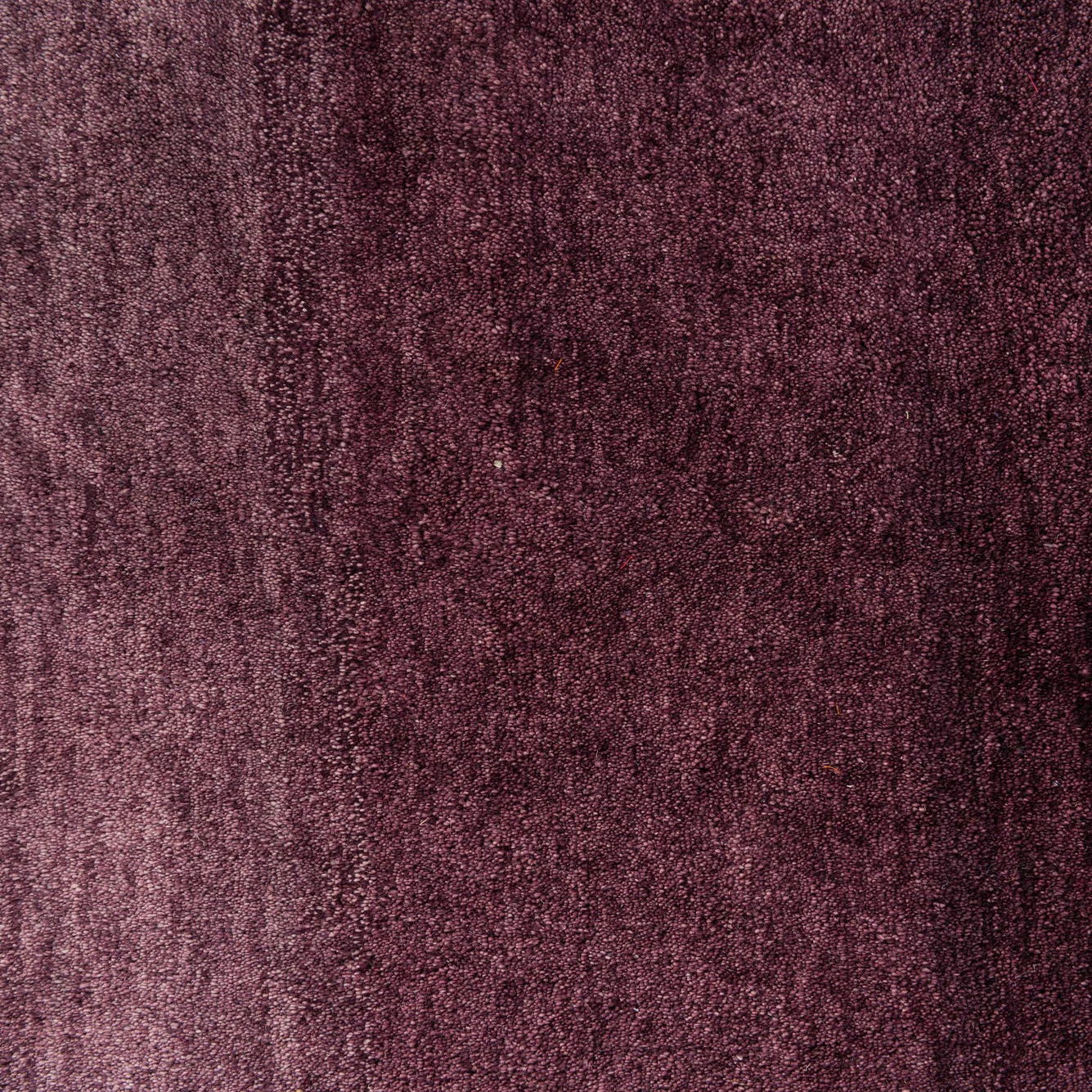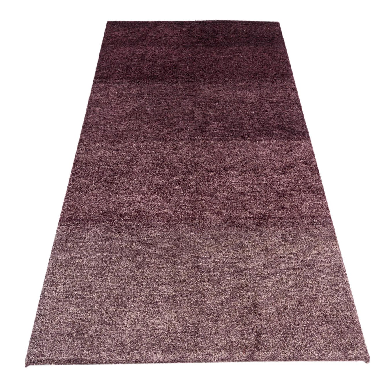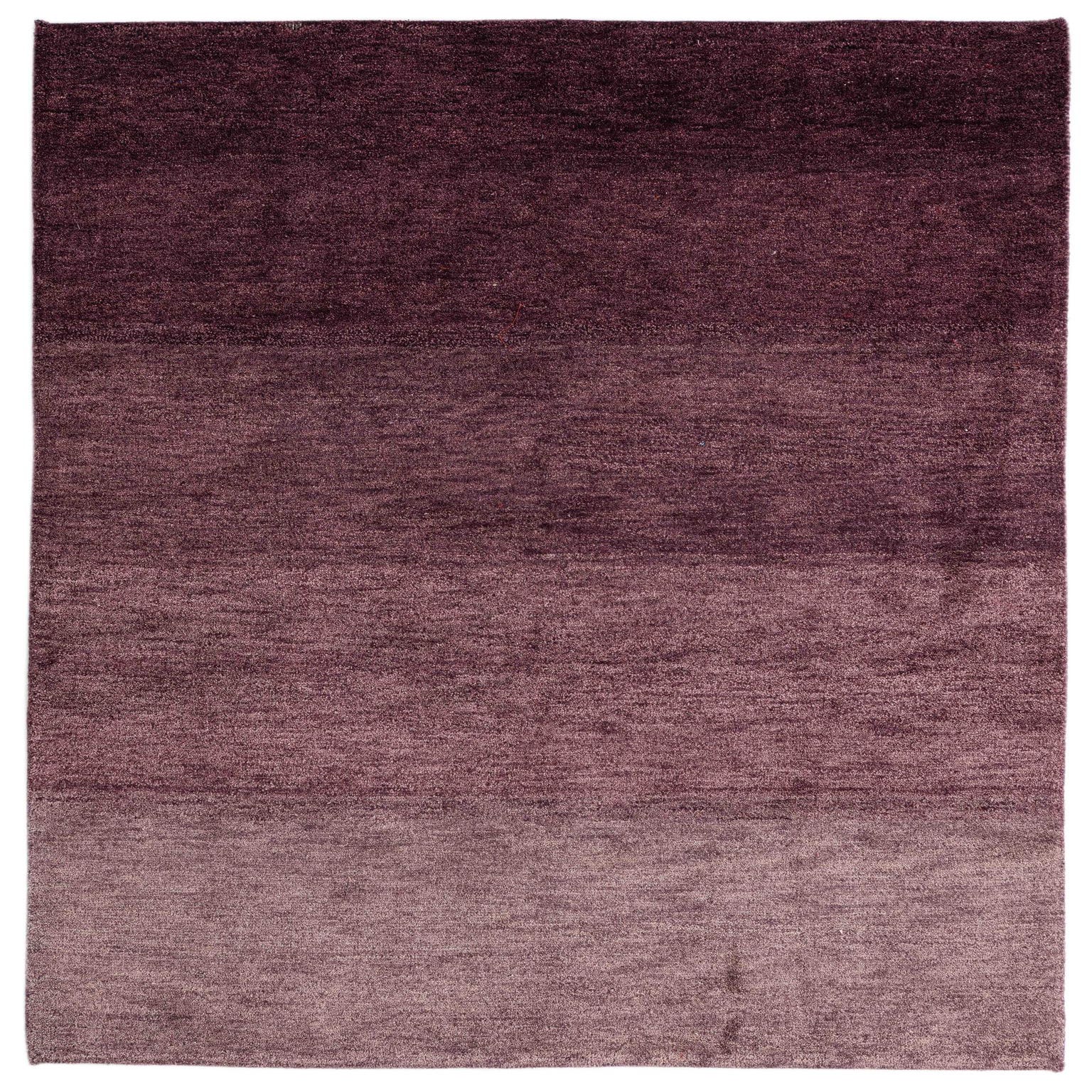 A 5x8 rectangular purple modern area rug with a subtle horizontal ombre effect, handmade from wool.