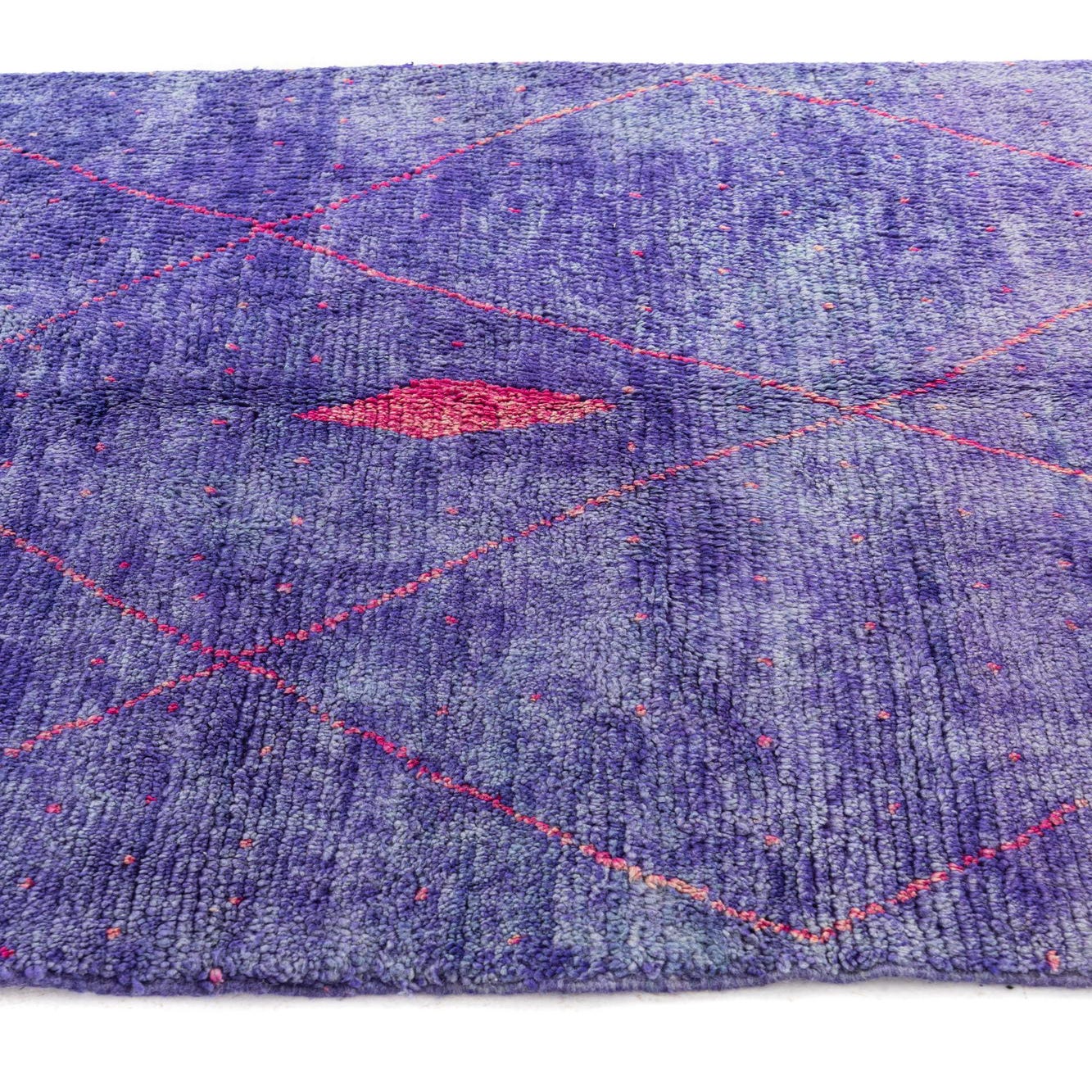 A deep purple field sets a rich, velvety backdrop for a simple diamond lattice worked in warm pink tones. Tiny pink scatter dots dance across the surface and two elongated pink diamonds at the center add a subtle focal point. Hand-knotted of 100% wool, the pile is soft and plush with a gentle sheen and slight variations from the handcrafting process that give the rug a tactile, lived-in quality; short cream fringe trims the ends for a finished look.