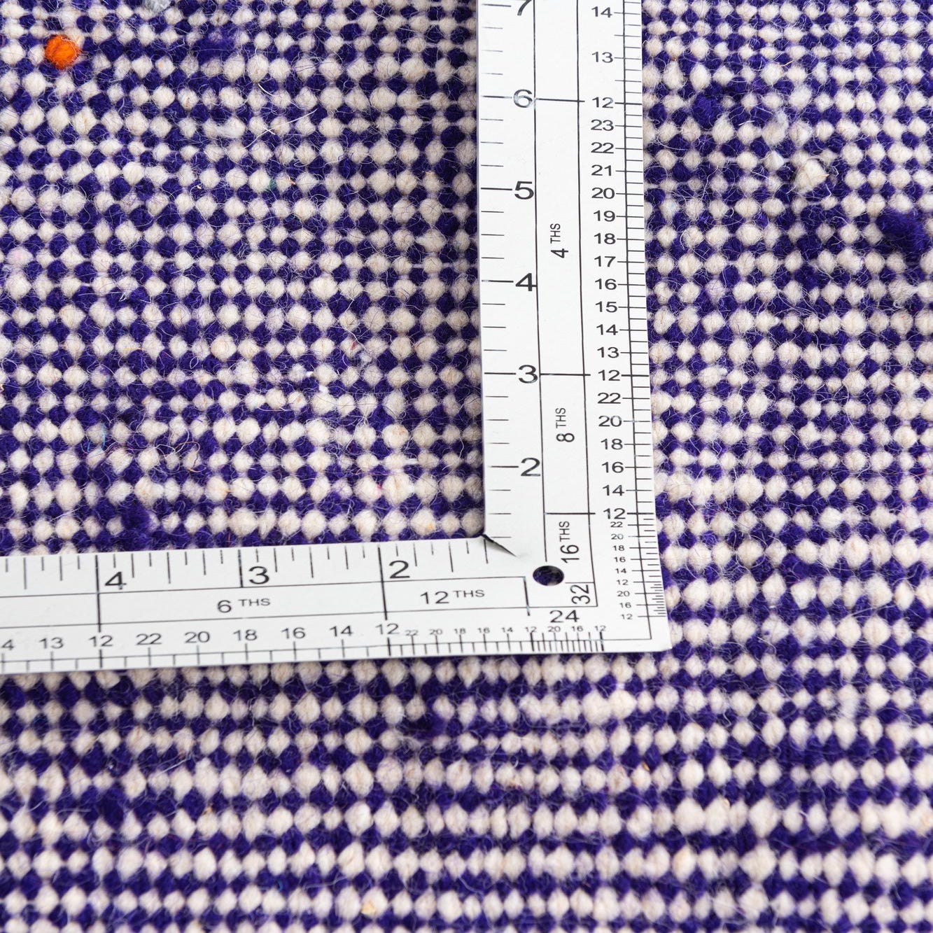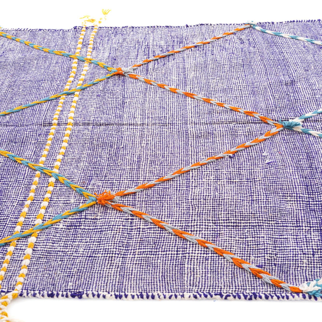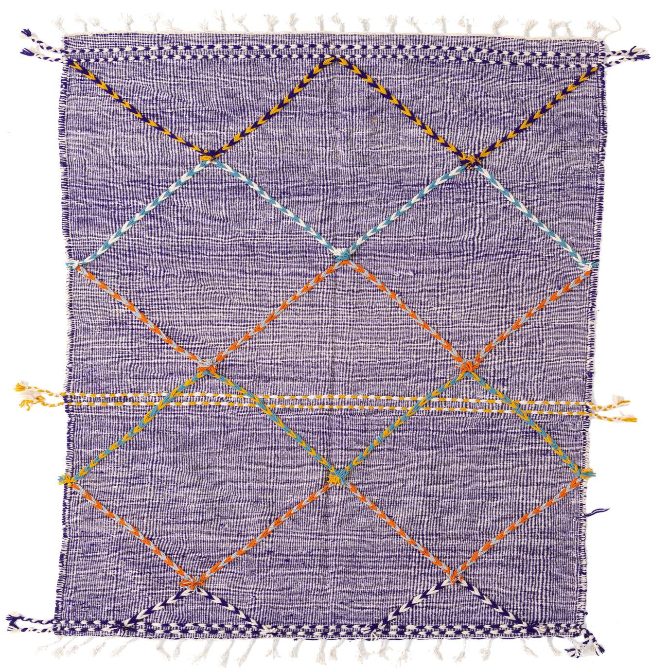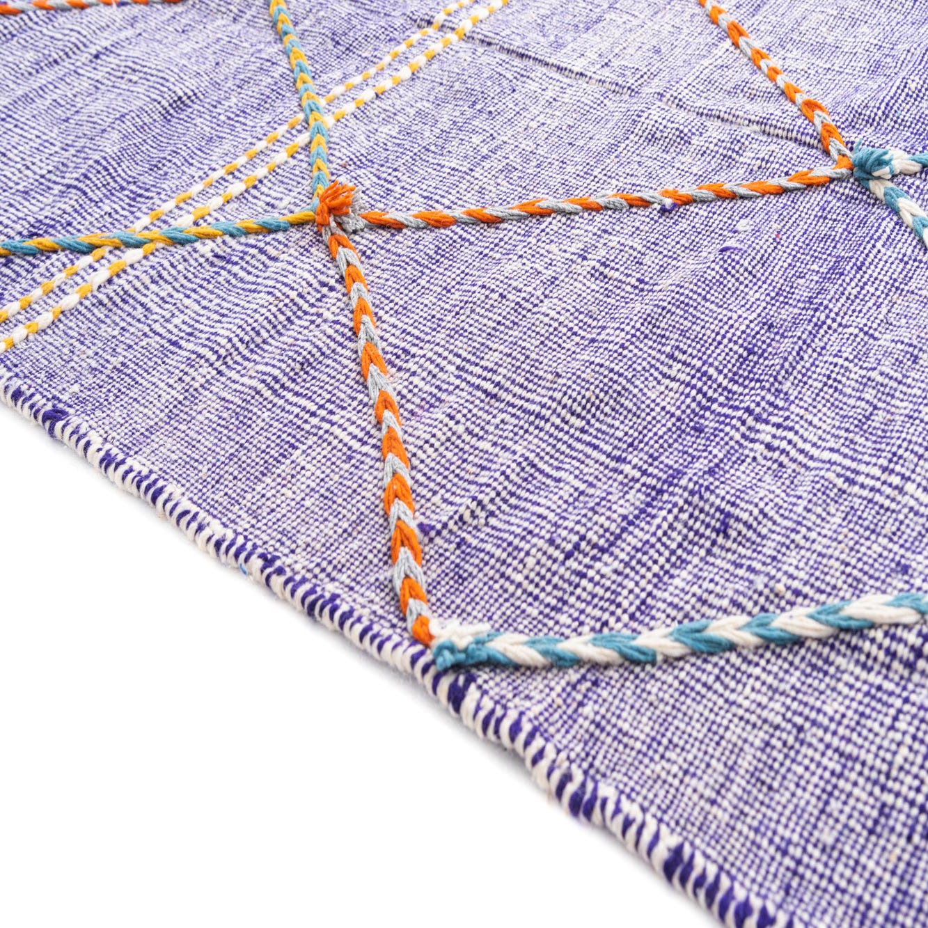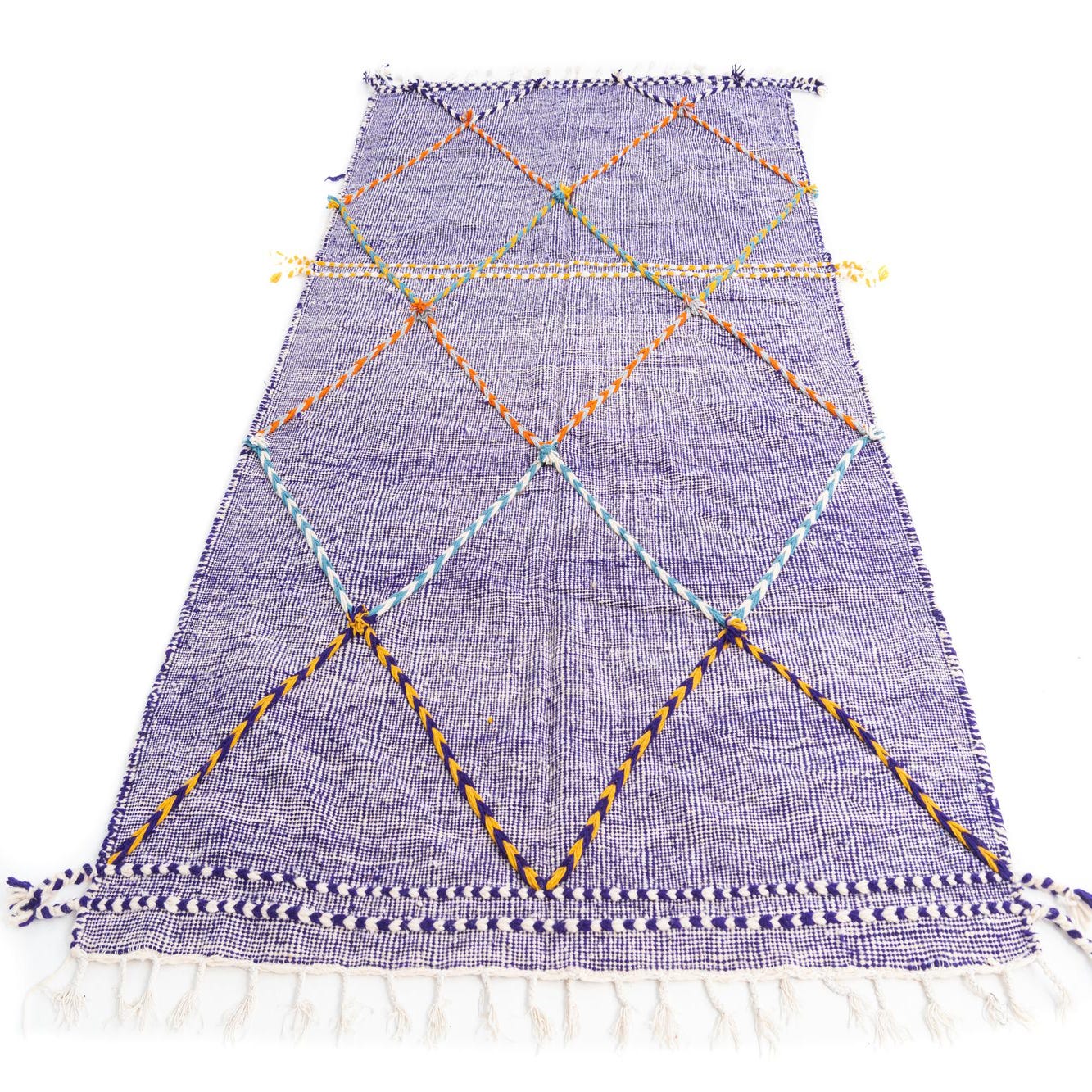 A 5x8 rectangular purple shag rug with a modern tribal pattern of orange, yellow, and blue diamond lines.