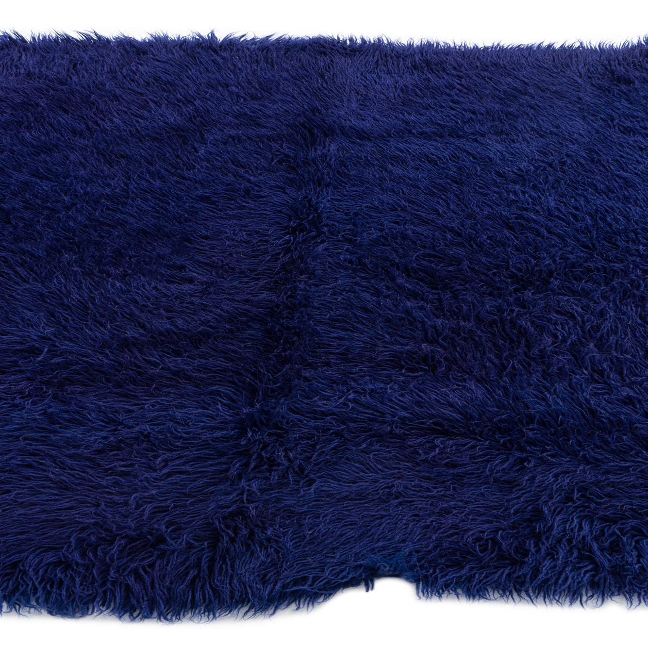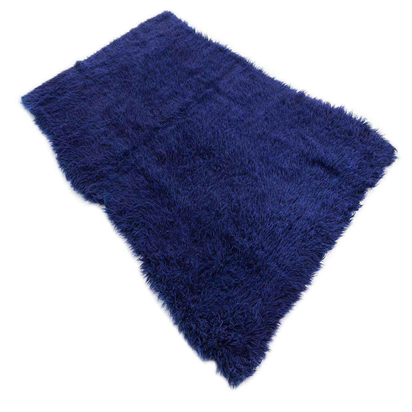 A rectangular 5x8 purple shag rug, handmade from wool, featuring a plush texture ideal for a living room or bedroom.