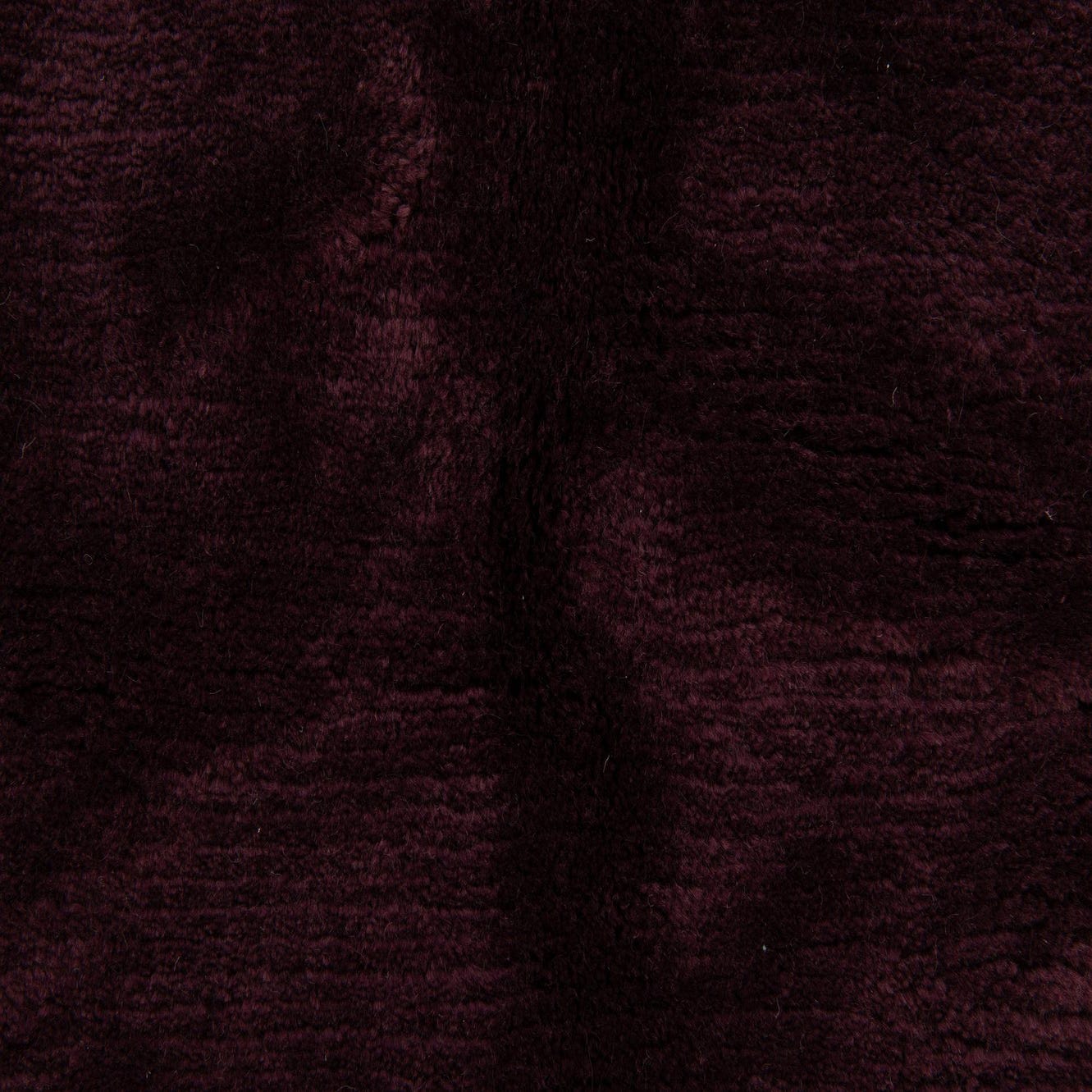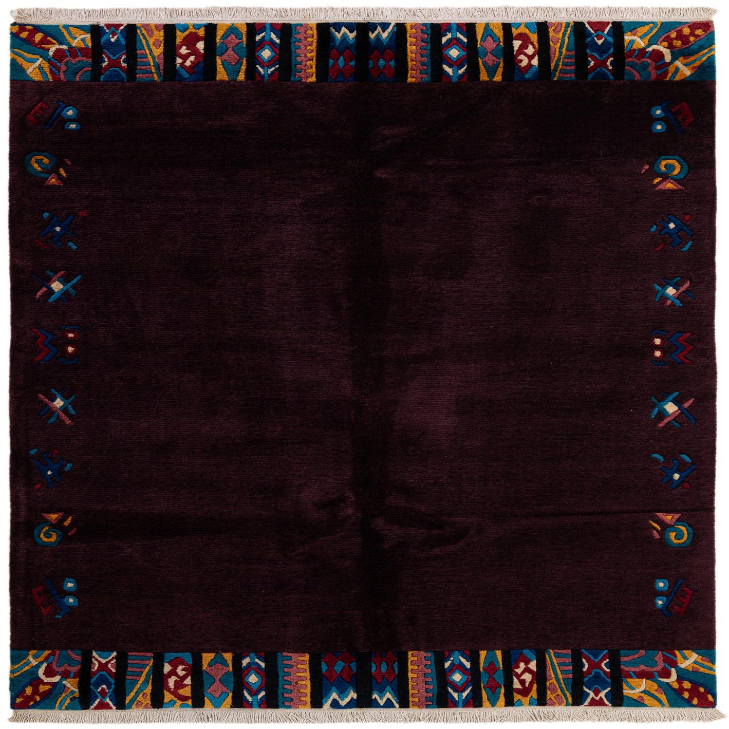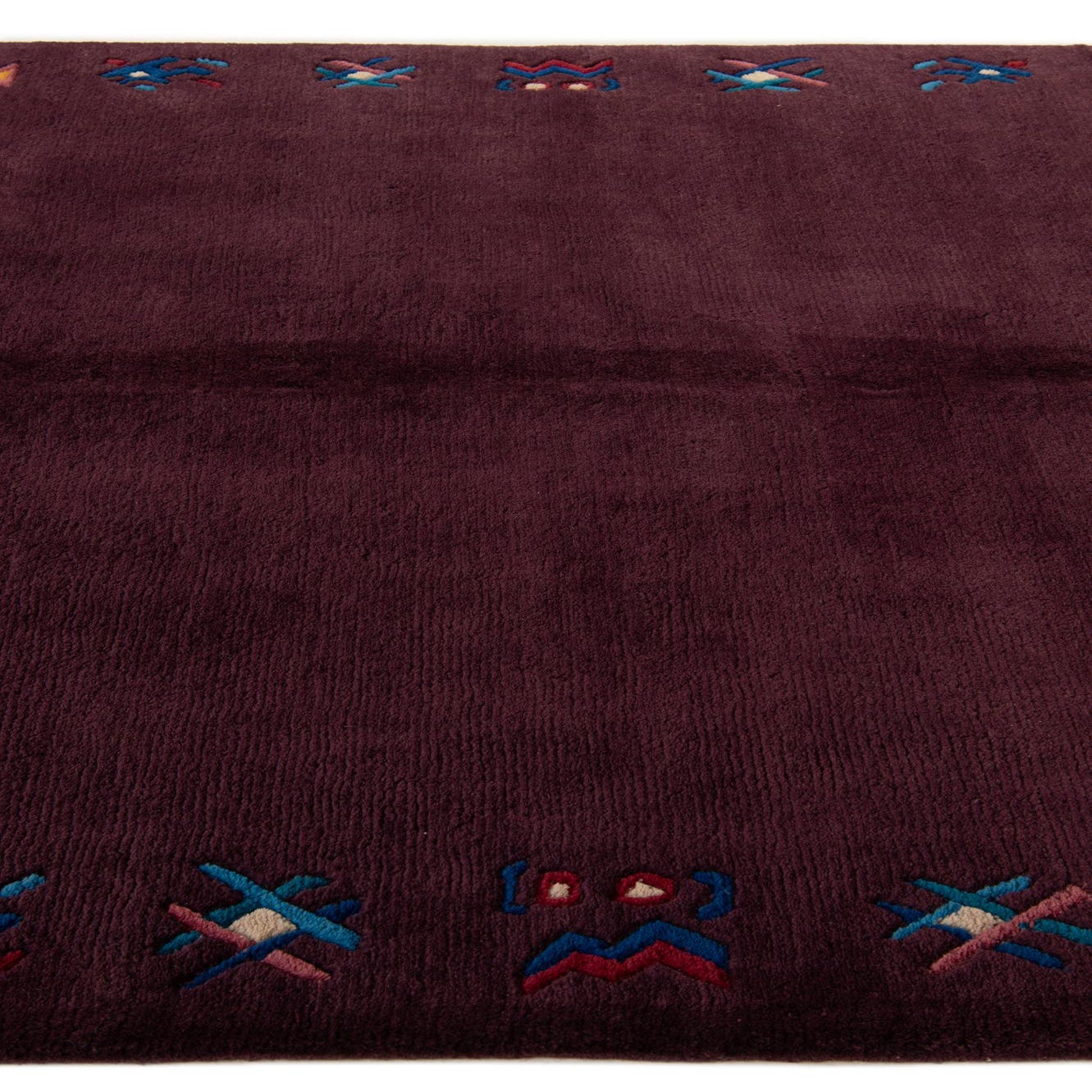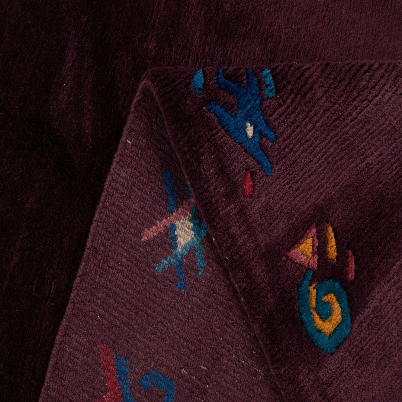 A 5x8 rectangular purple wool area rug with a modern abstract border in blue, yellow, and red.