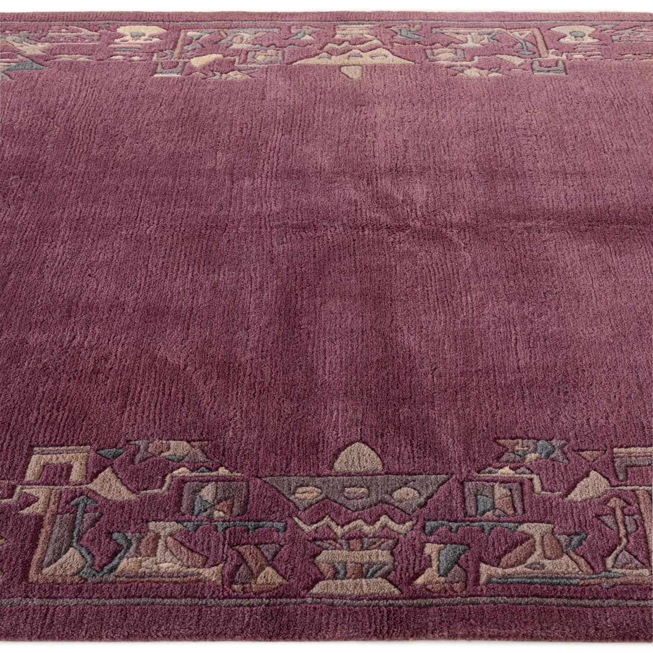 A 5x8 rectangular purple wool rug with a medium pile, featuring an abstract, modern border pattern in muted tones of beige, green, and gray, suitable for a living room.