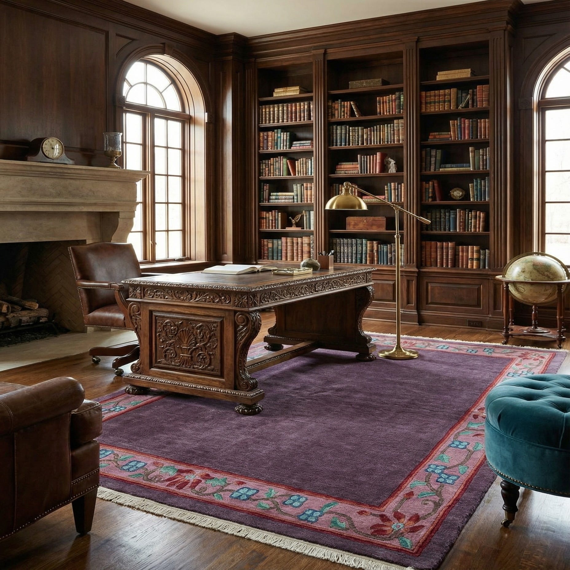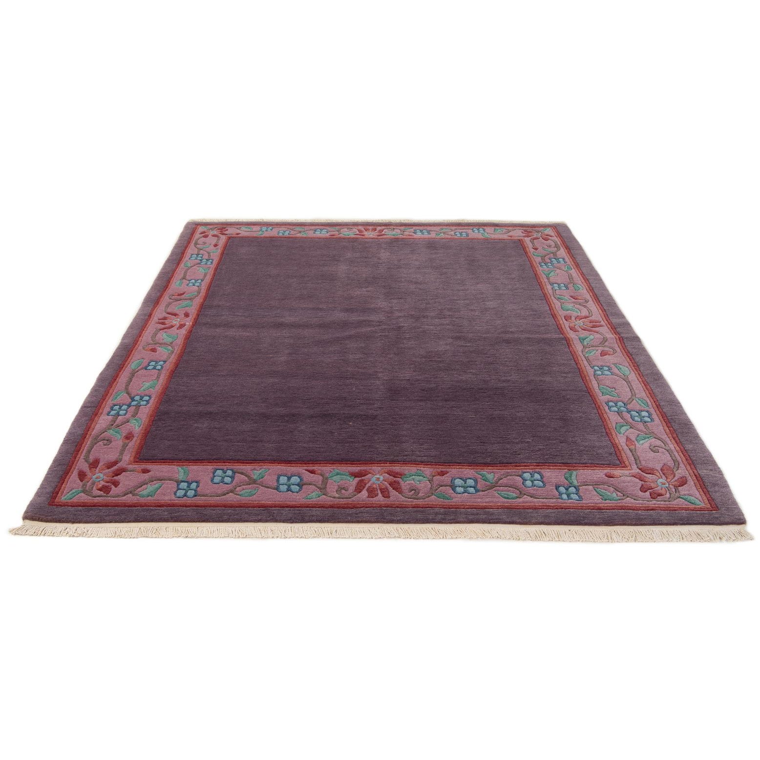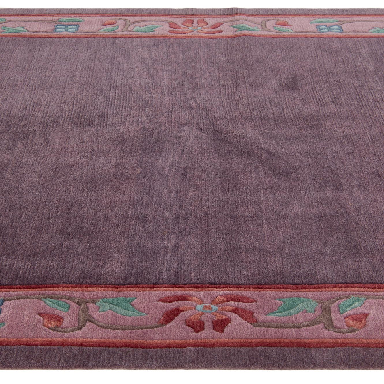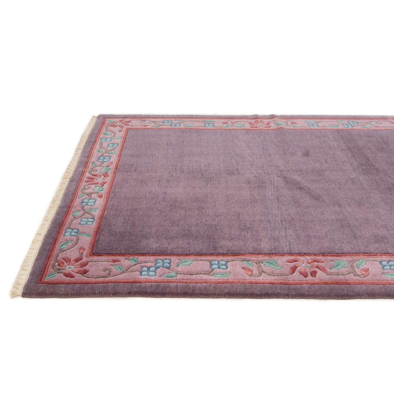 A 5x8 rectangular purple wool rug with a pink border featuring an oriental floral pattern of blue and red flowers and green leaves.