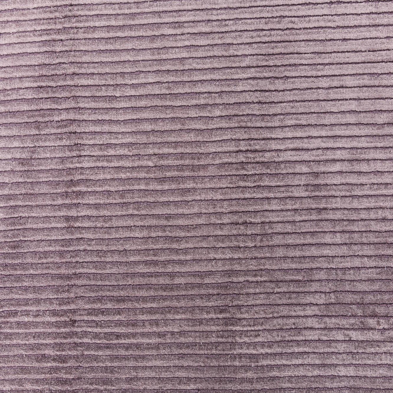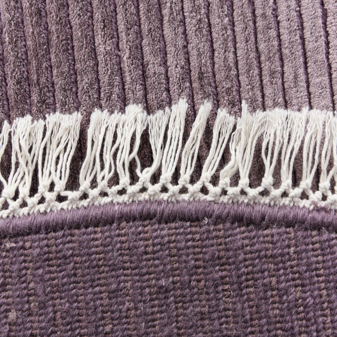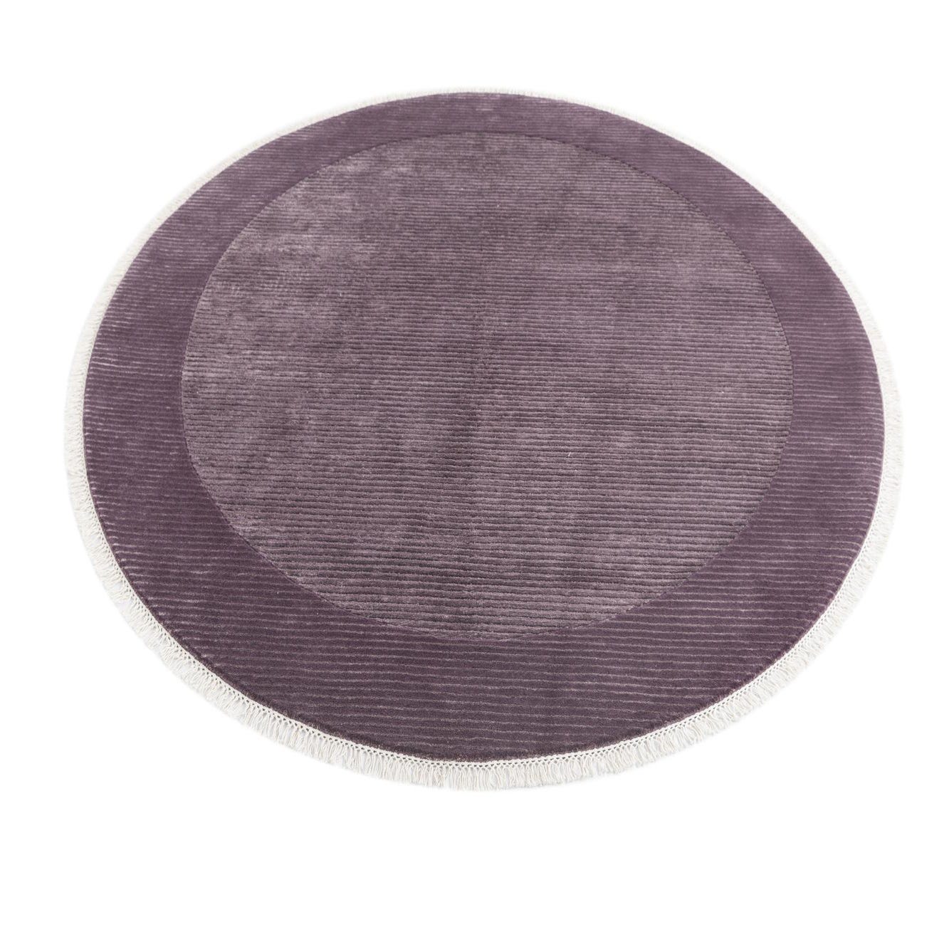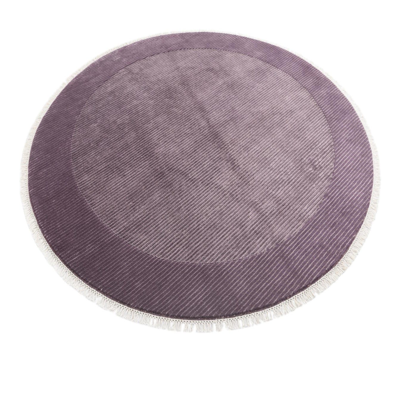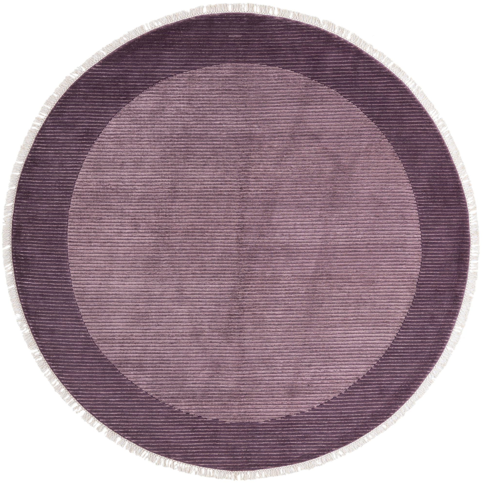 A 6' 5 x 6' 5 round purple wool rug with a modern oriental design and white fringe.