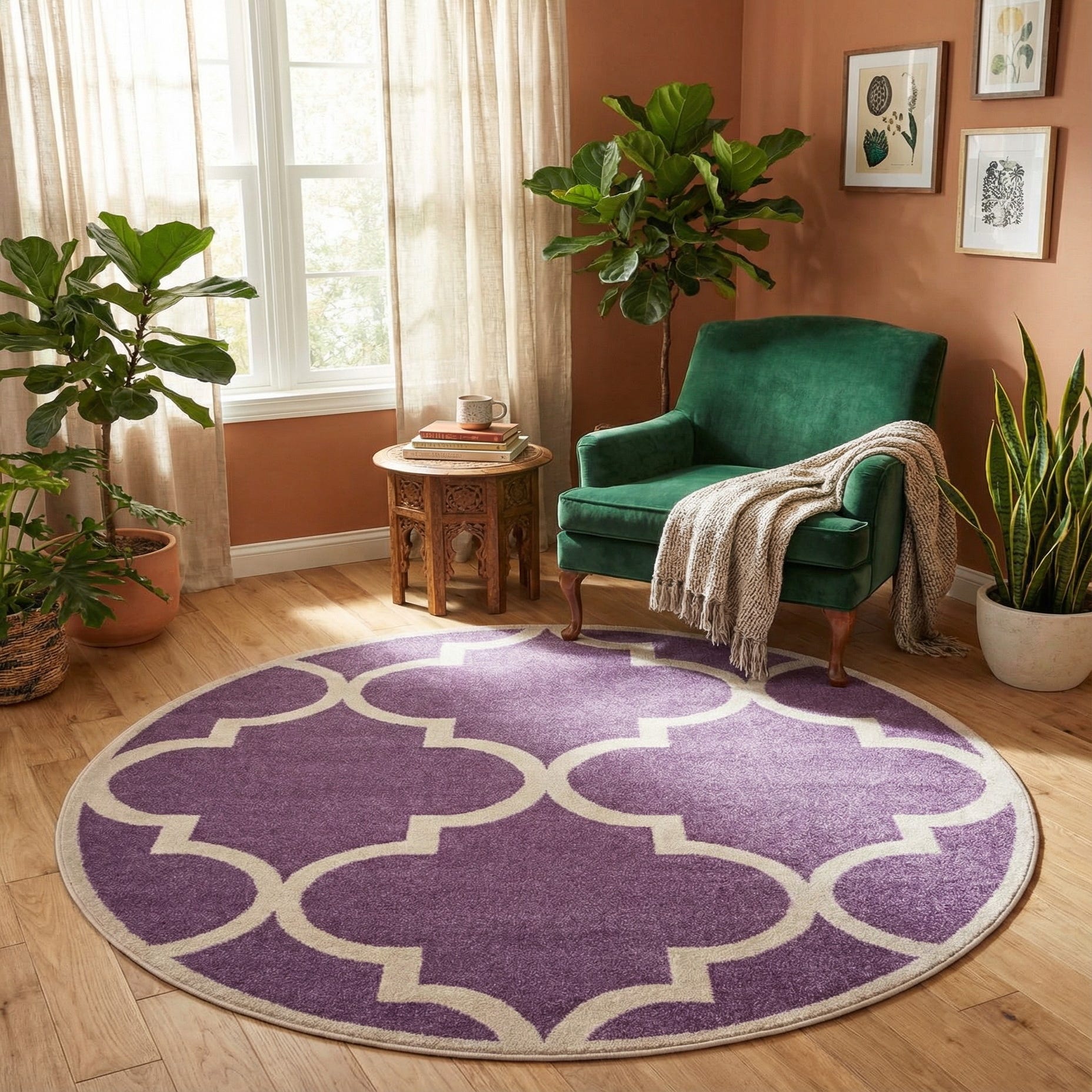A bold, graphic lattice pattern defines this round rug, with large ivory arabesque motifs set against a purple background for a modern take on classic trellis styling. Machine made from 100% polypropylene, the rug has a low-cut pile with a smooth, slightly lustrous surface that feels soft underfoot while keeping the pattern edges crisp and well-defined. The circular shape highlights the repeating geometry and creates a clear focal point in any room.