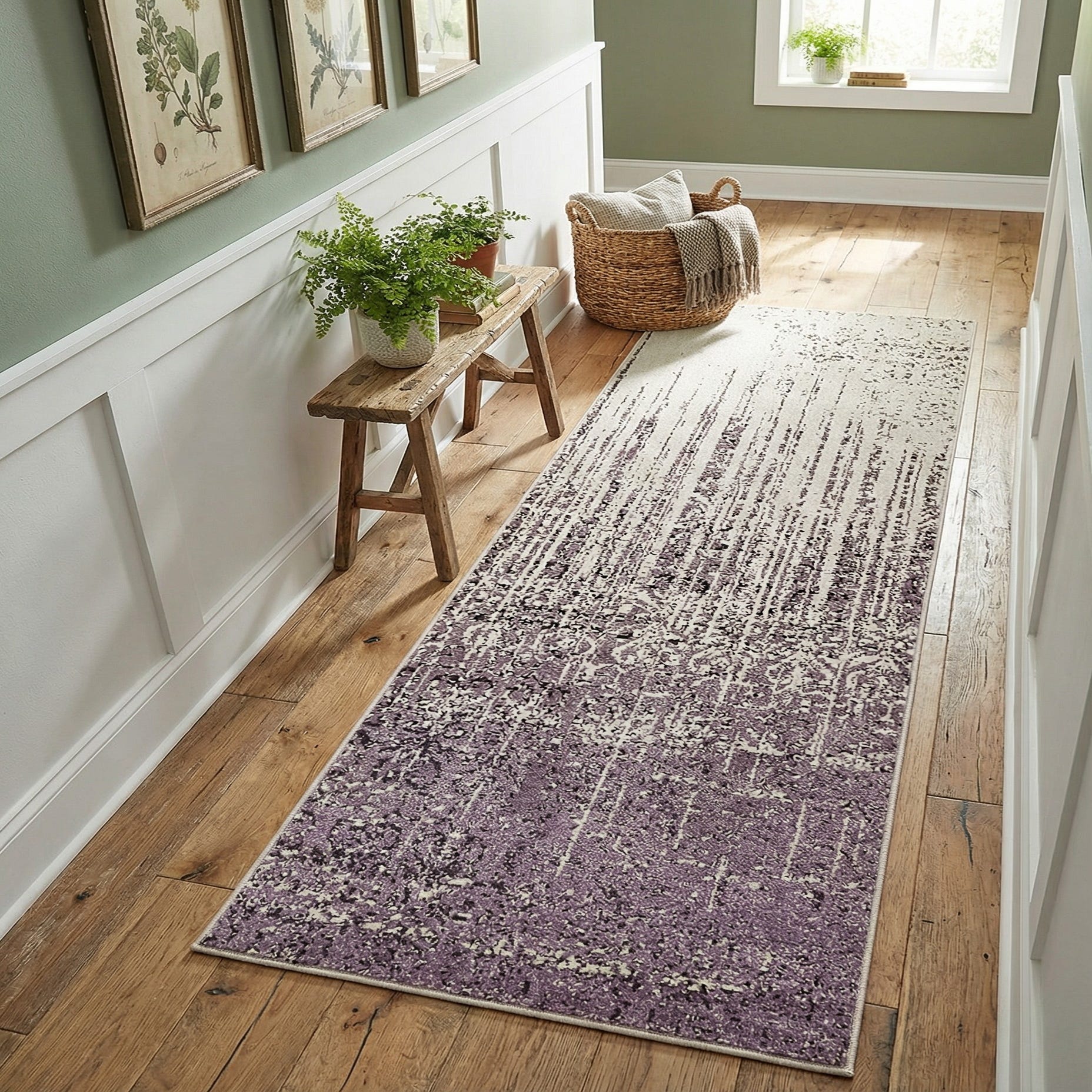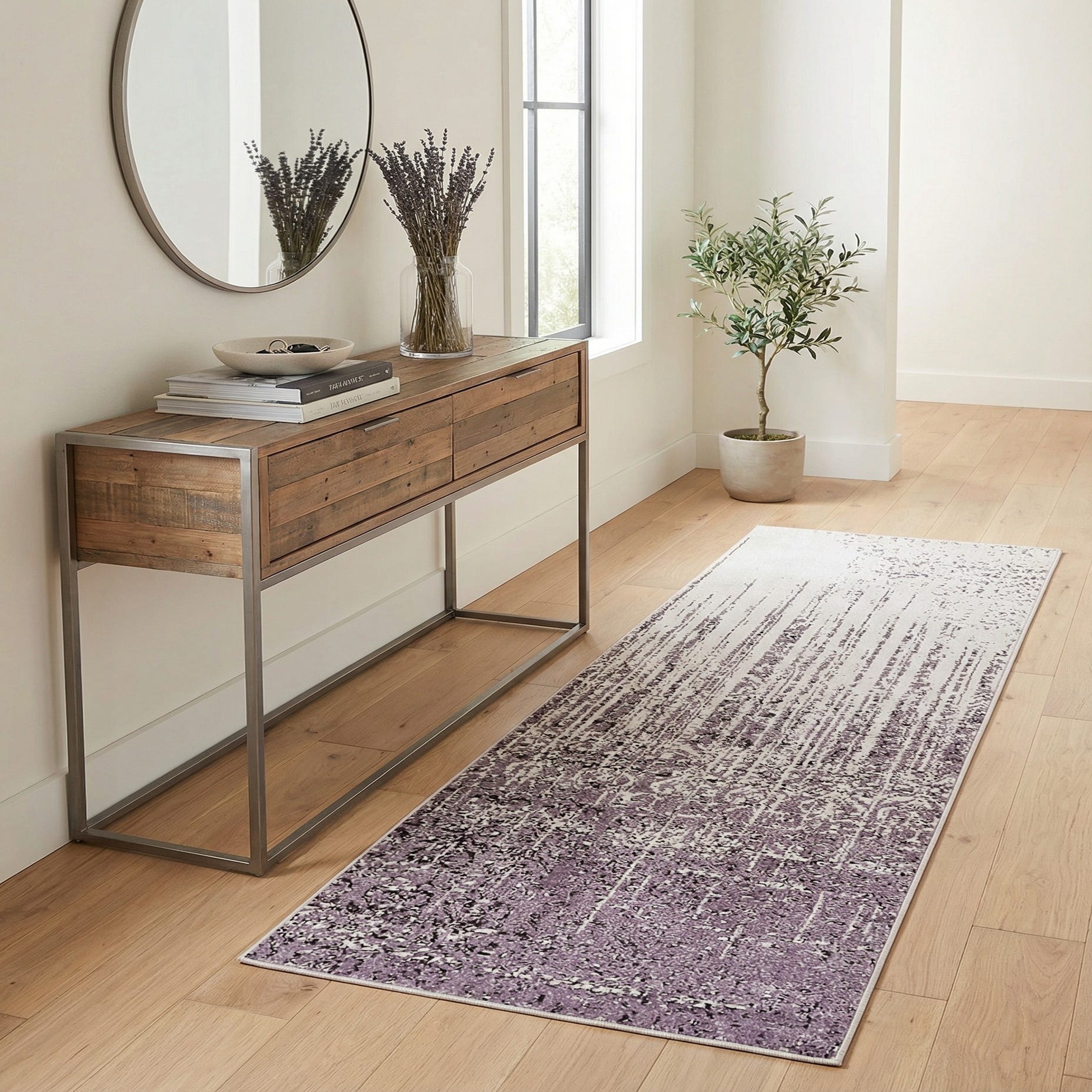 The Angelica collection presents a modern 6 Ft Runner rug, an elegant addition to any long and narrow space. Crafted with precision using a machine-woven technique, this piece offers both durability and a soft texture, due to its 100% polypropylene fibers. The rug features a rich purple background, gracefully adorned with ivory and violet patterns that create a visually dynamic display. The design suggests a rainfall motif with dispersed, organic lines, offering a contemporary aesthetic with a sense of movement.