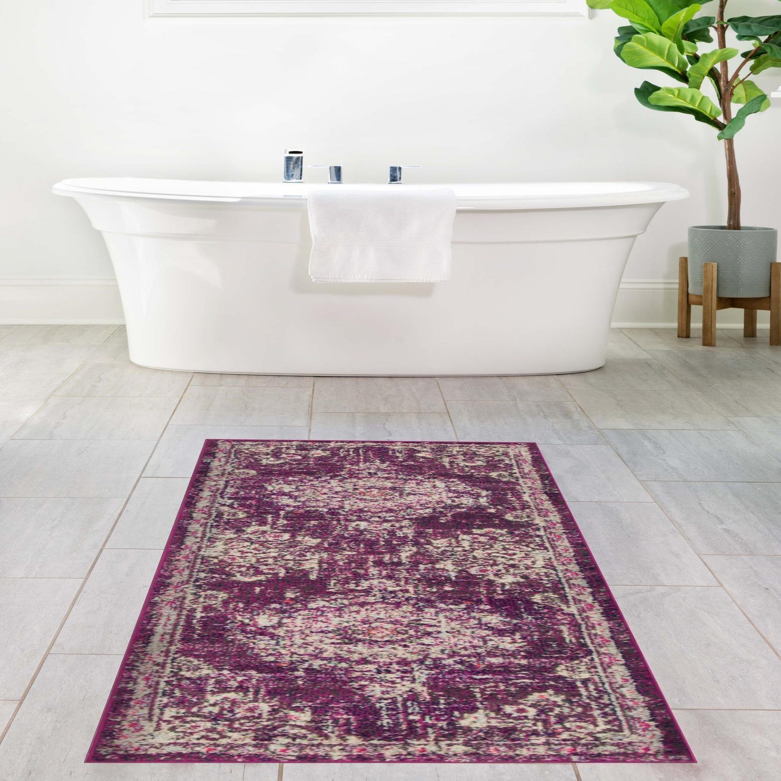 Primary color is Purple. Colors in this rug include: Purple, Brown, Gray, Ivory, Red, Pink.
