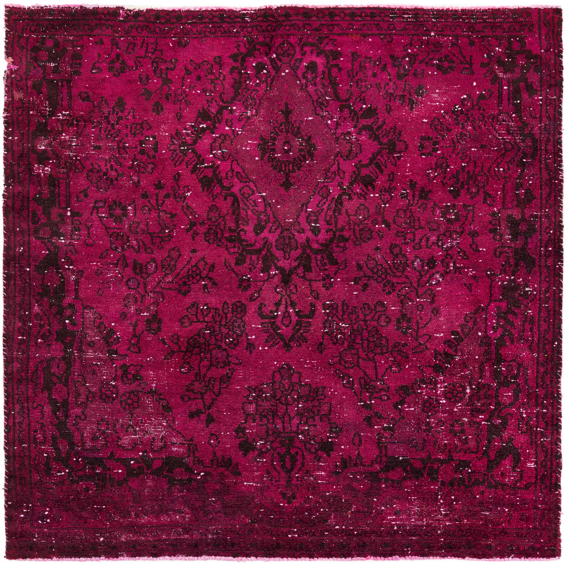 A 5' 5 x 5' 10 square purple Persian rug with a faded medallion pattern and distressed finish, suitable for an indoor living space.