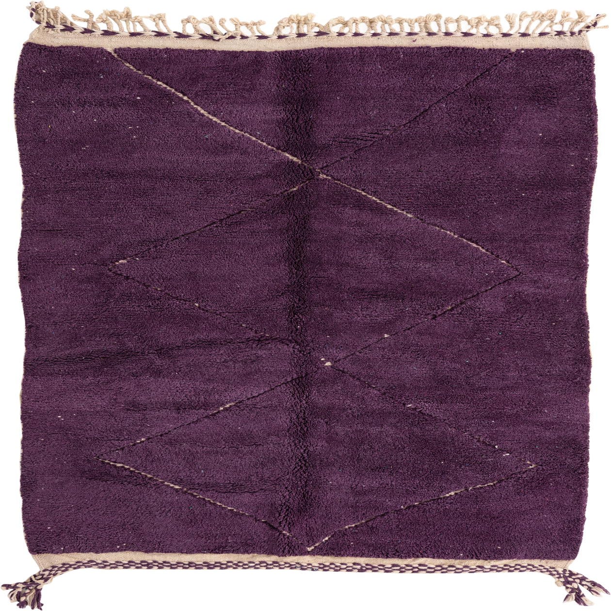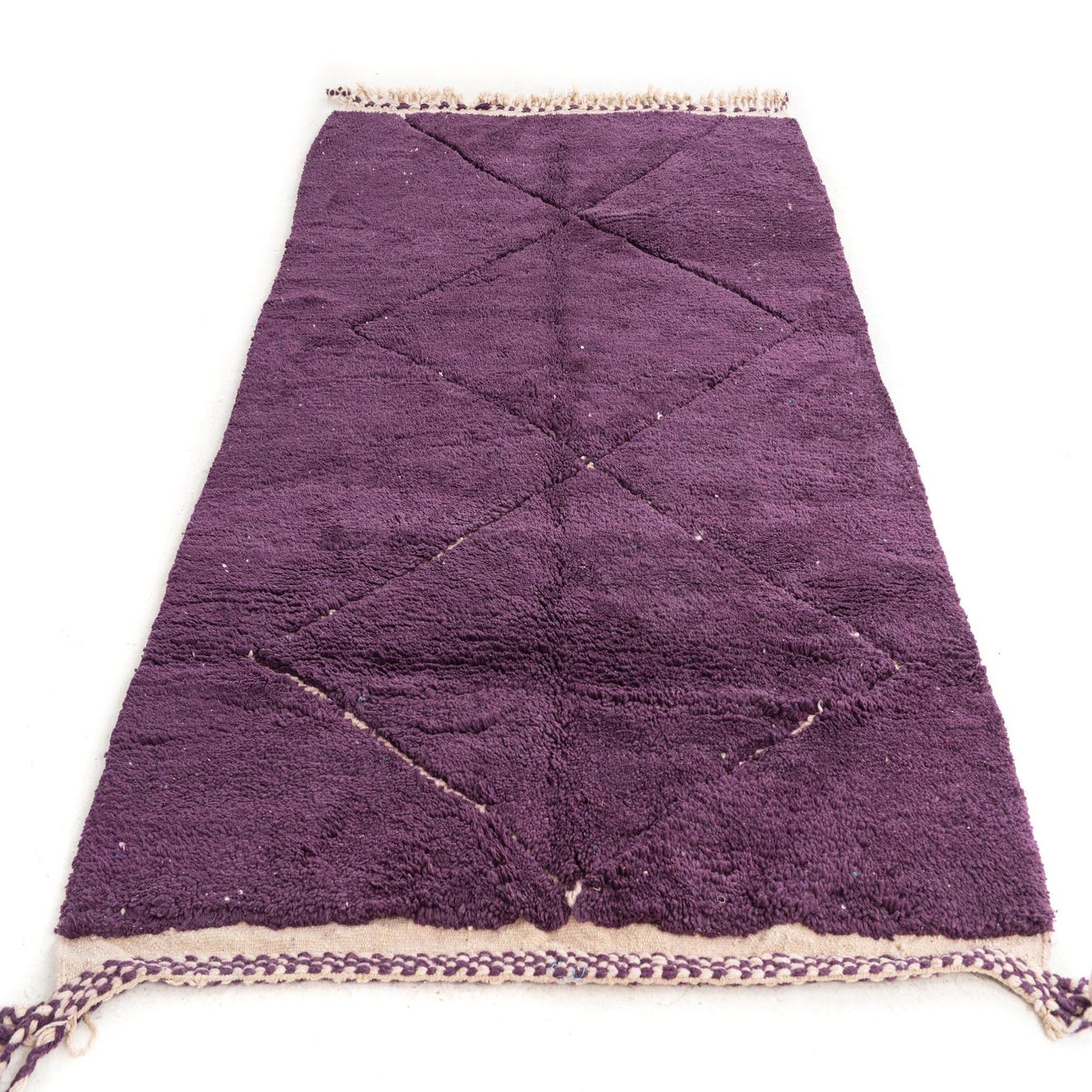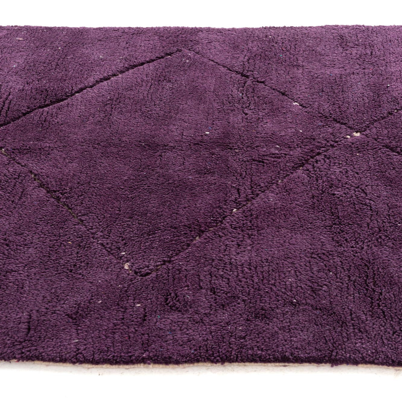 This Moroccan collection rug is a hand-knotted piece, crafted with care from 100% wool to bring both warmth and texture to your space. Designed in a versatile 6x9 size, the rug presents a bold purple backdrop that anchors the design, while ivory accents create a geometric diamond pattern. These contrasting colors form a striking yet balanced visual that can imbue any room with a touch of elegance and character.