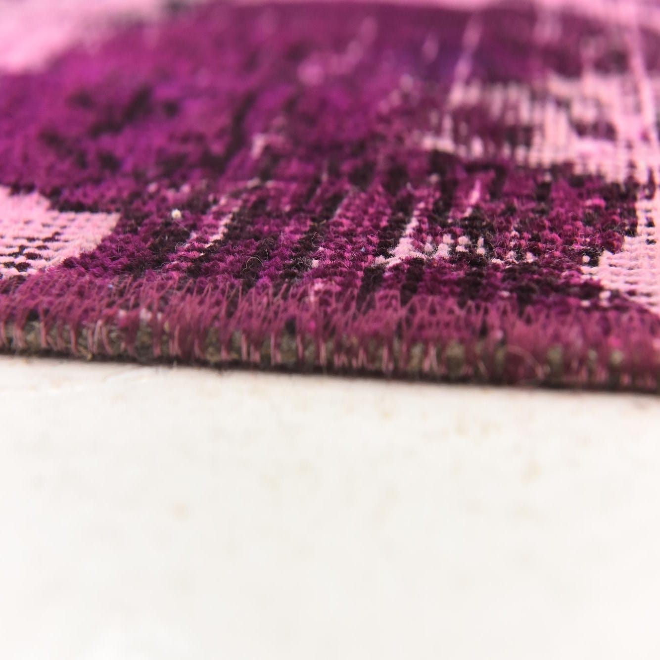 Hand-knotted from 100% wool, this rug presents a vintage-inspired, distressed pattern with a rich purple background that feels warm and tactile beneath your hand. Deep purple and navy blue shapes appear like worn medallions and painterly washes against areas of softer pink, while black distressing adds contrast and definition. The dense wool pile has subtle variations in height that create a gentle, lived-in texture and a soft underfoot feel.