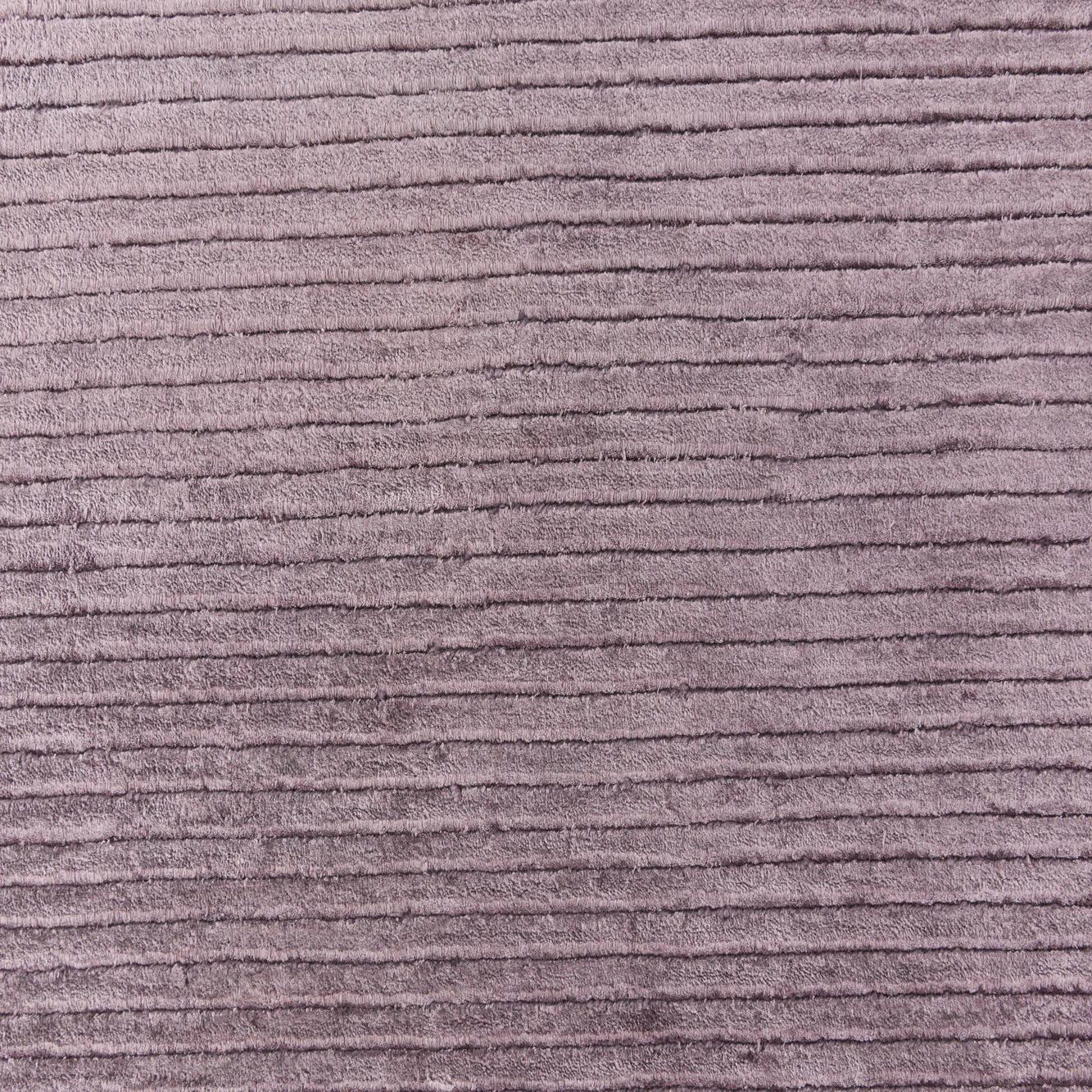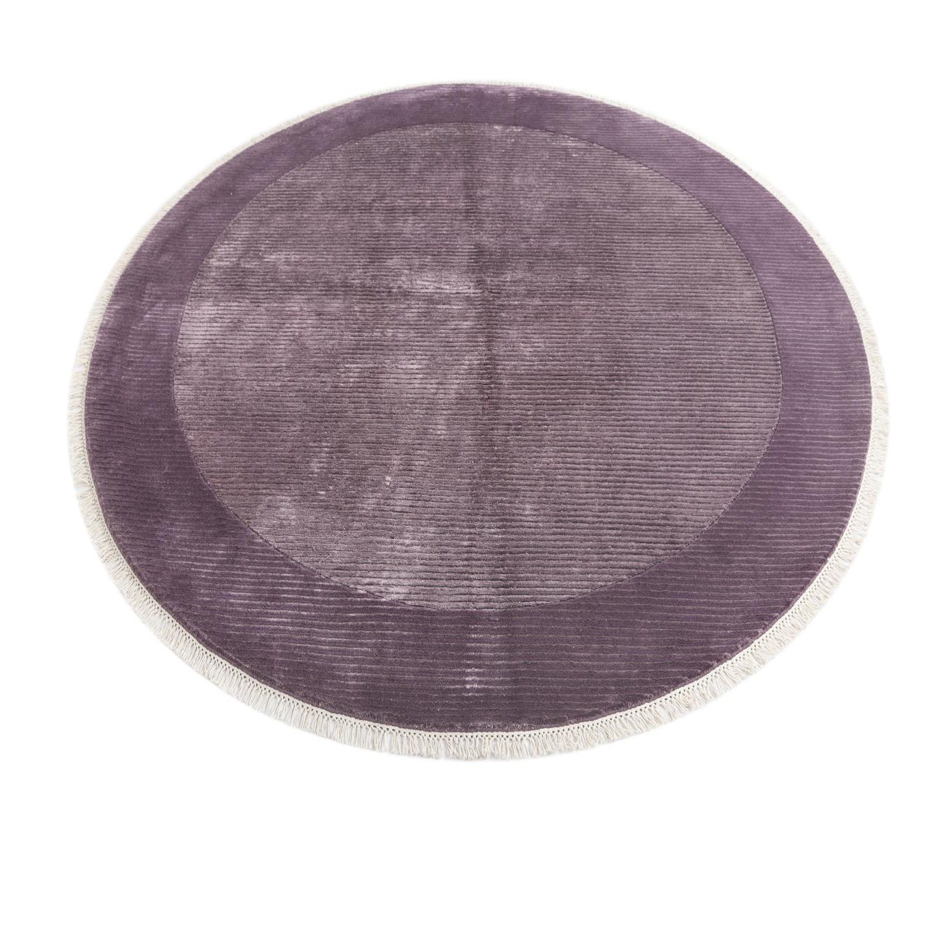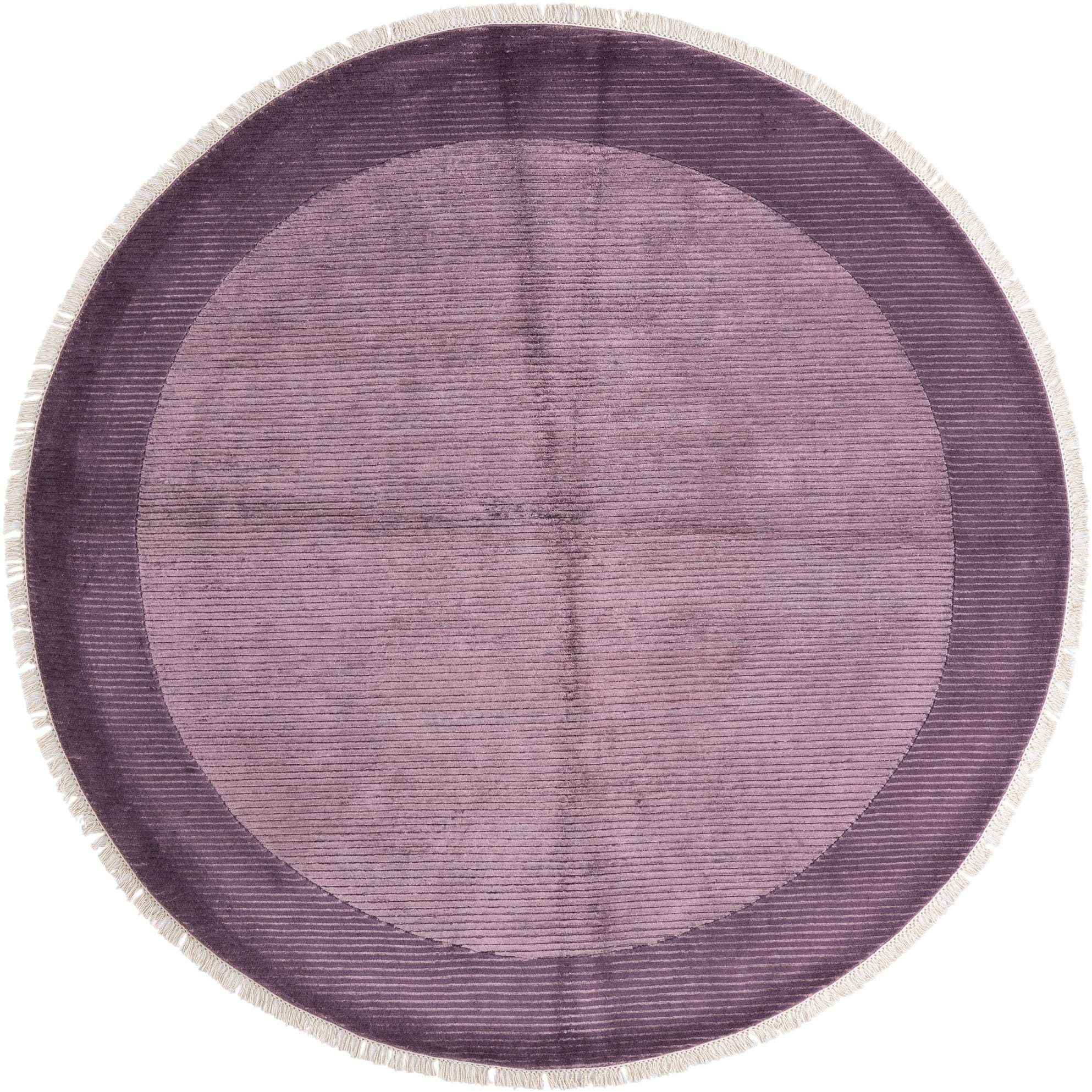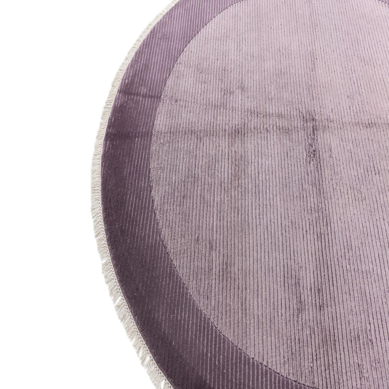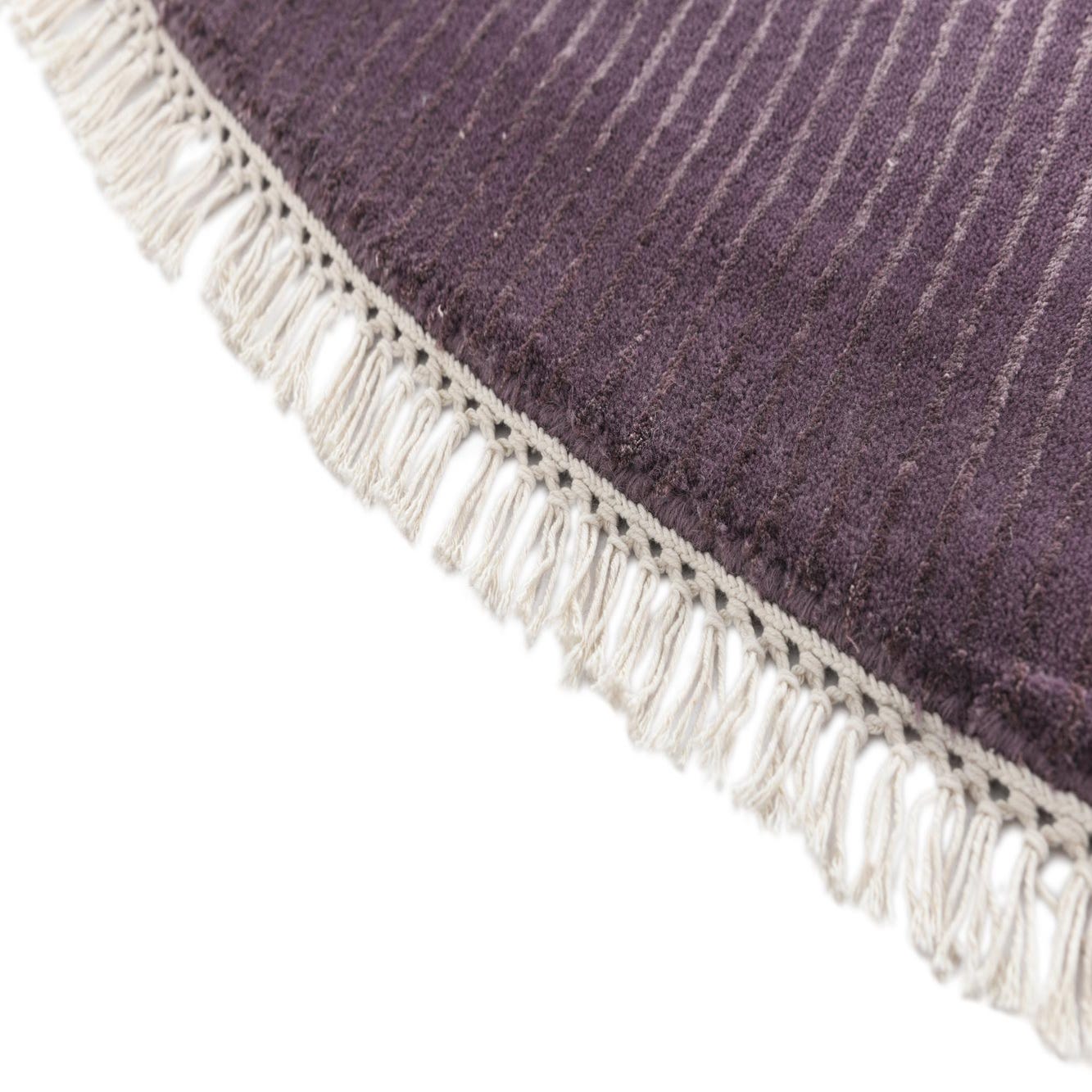 A round, handmade Darya rug with a high pile in varying shades of purple, featuring a modern striped pattern and white fringe.