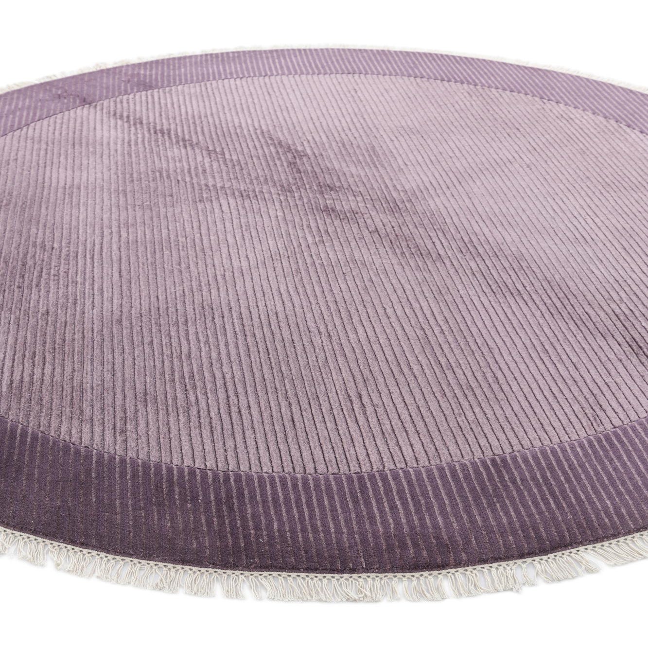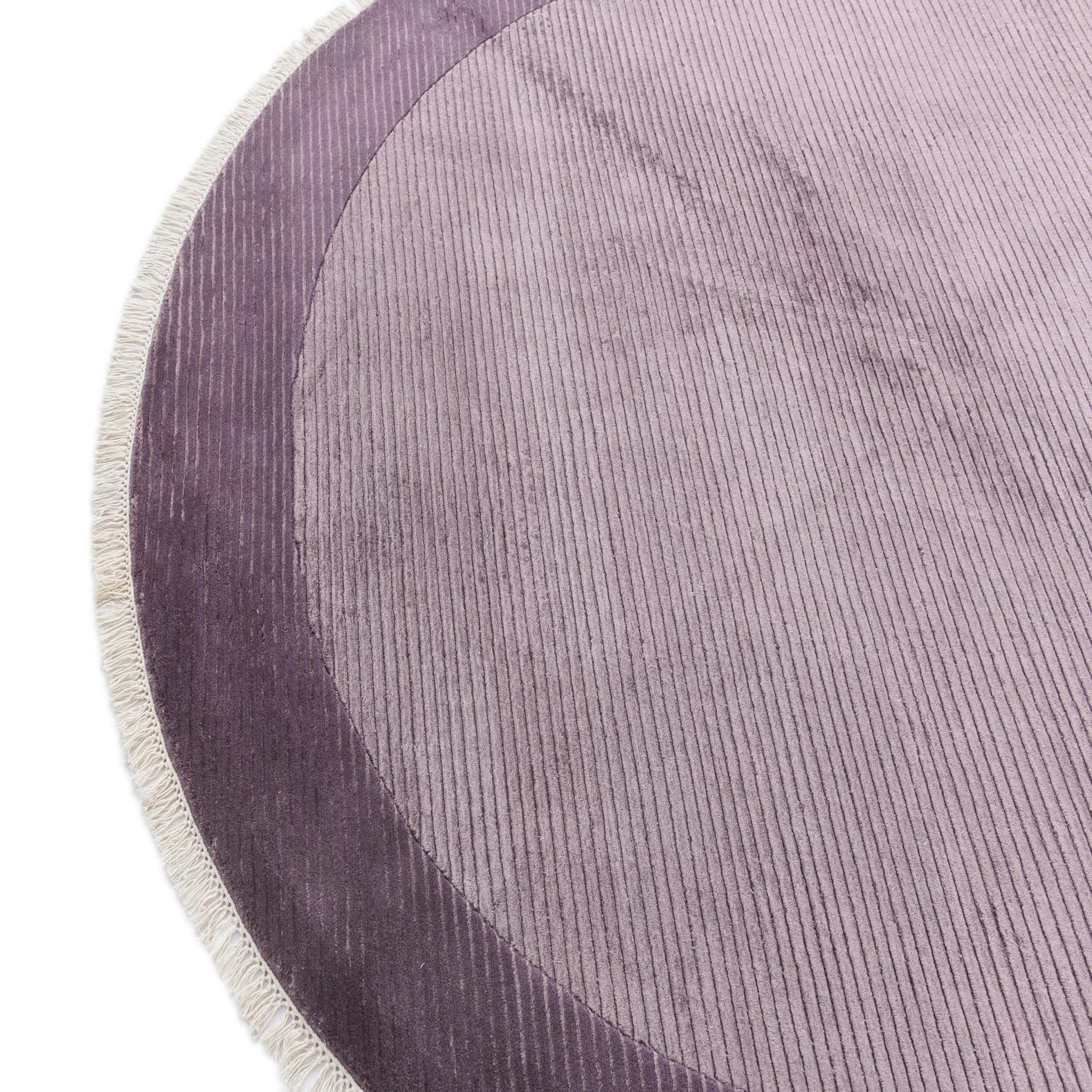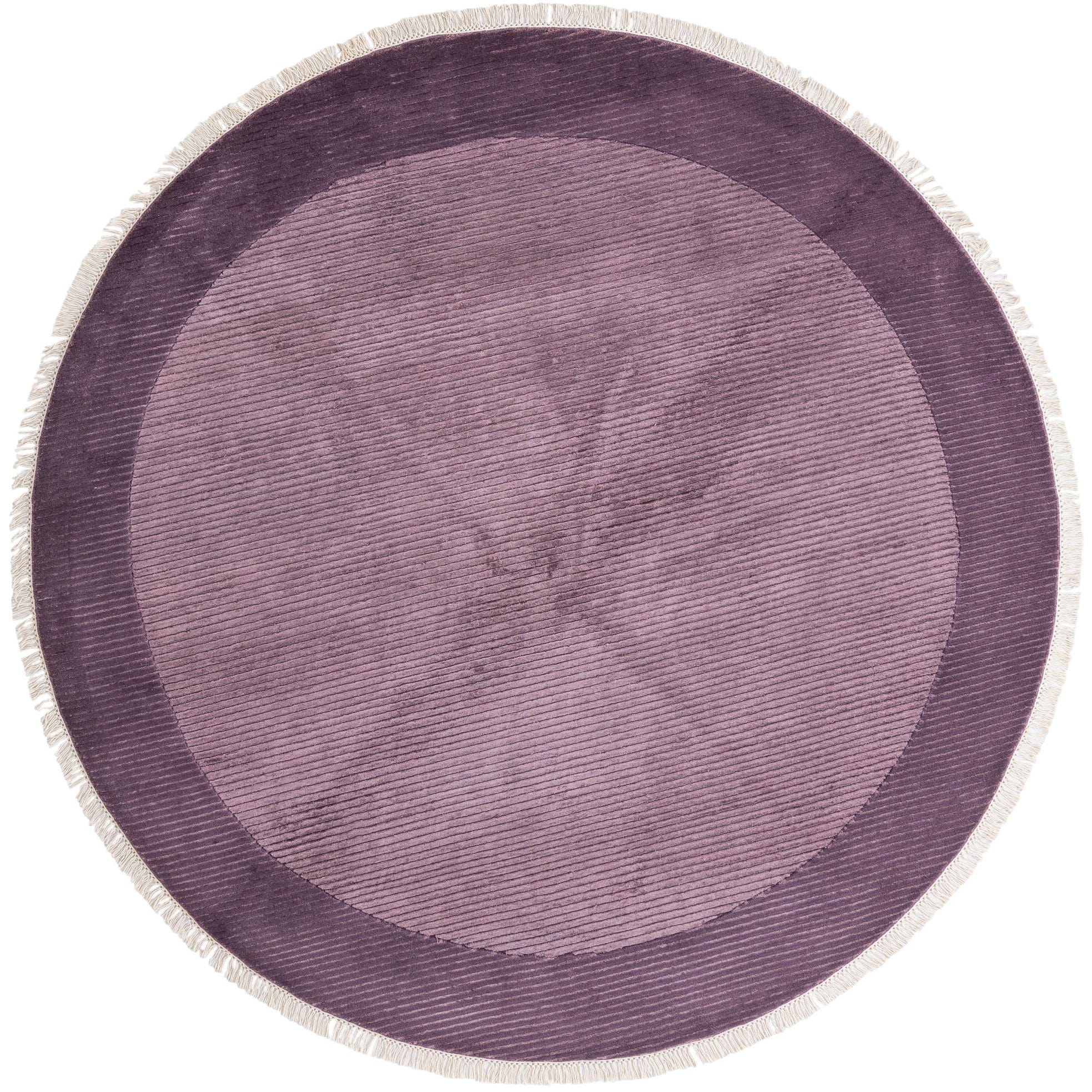 A 6' 7 round purple wool rug with a subtle striped texture and a darker purple border, featuring white fringe.