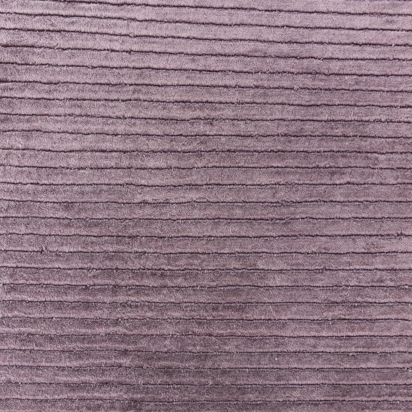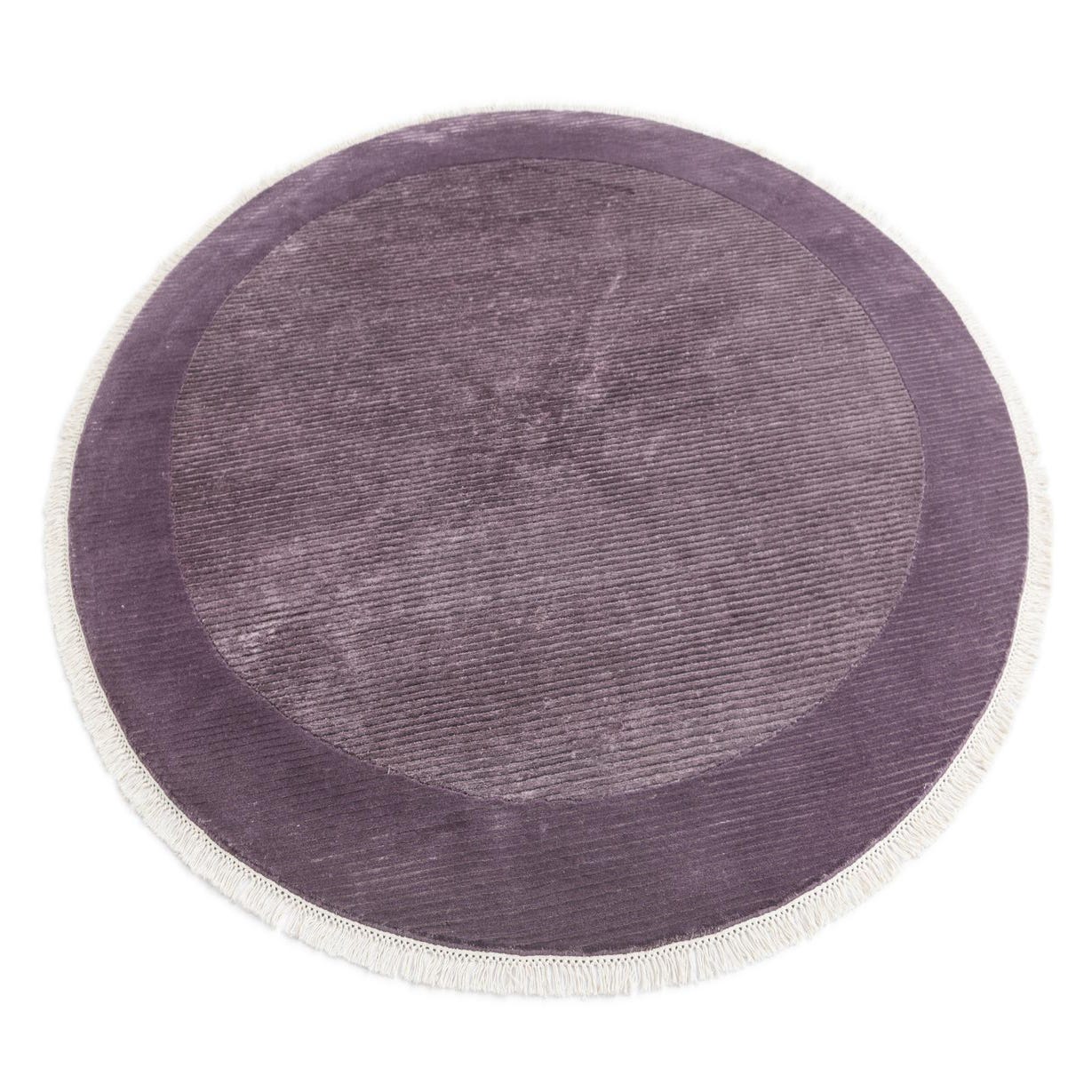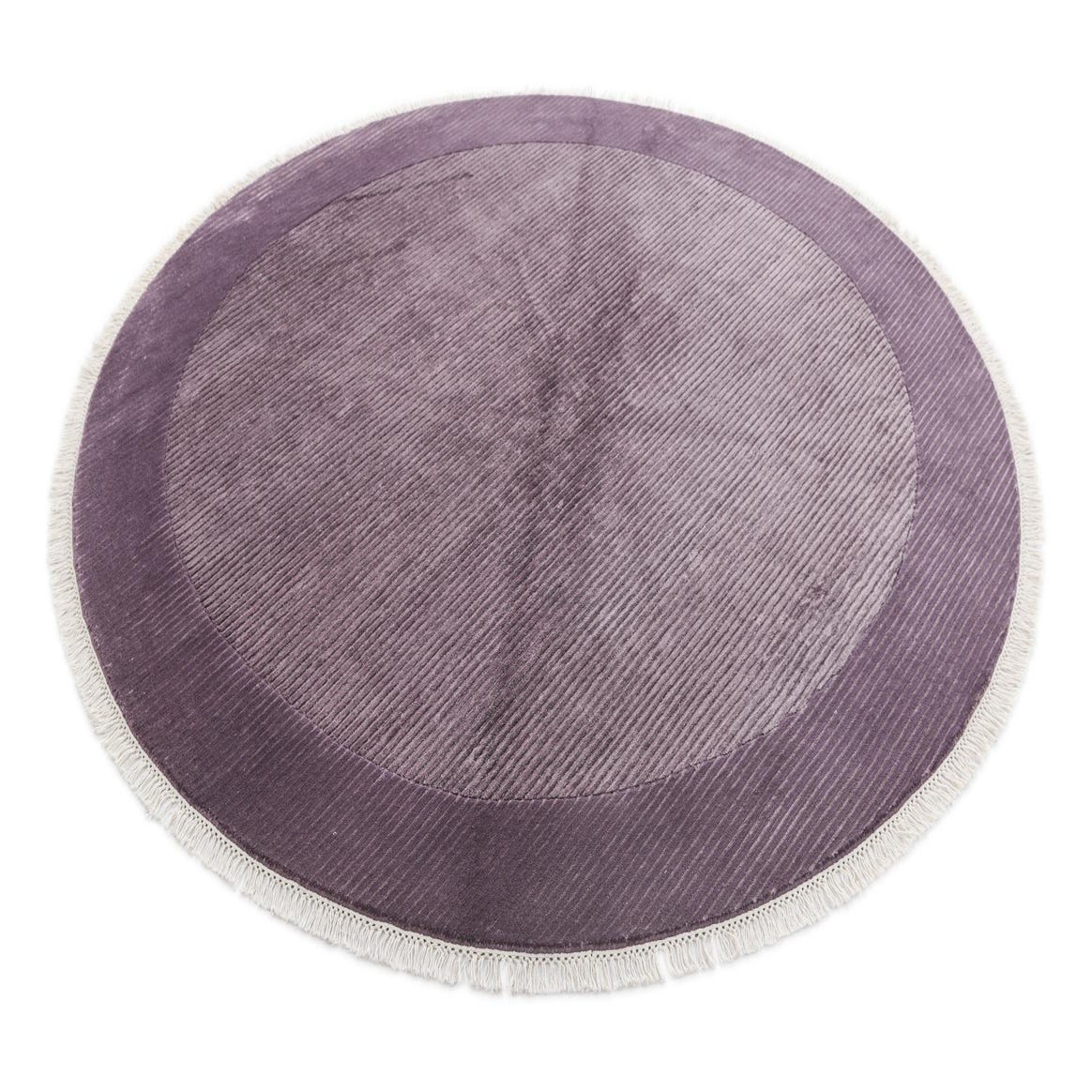 A 6' 7 round purple wool rug with a subtle striped texture and a darker purple border, featuring white fringe.