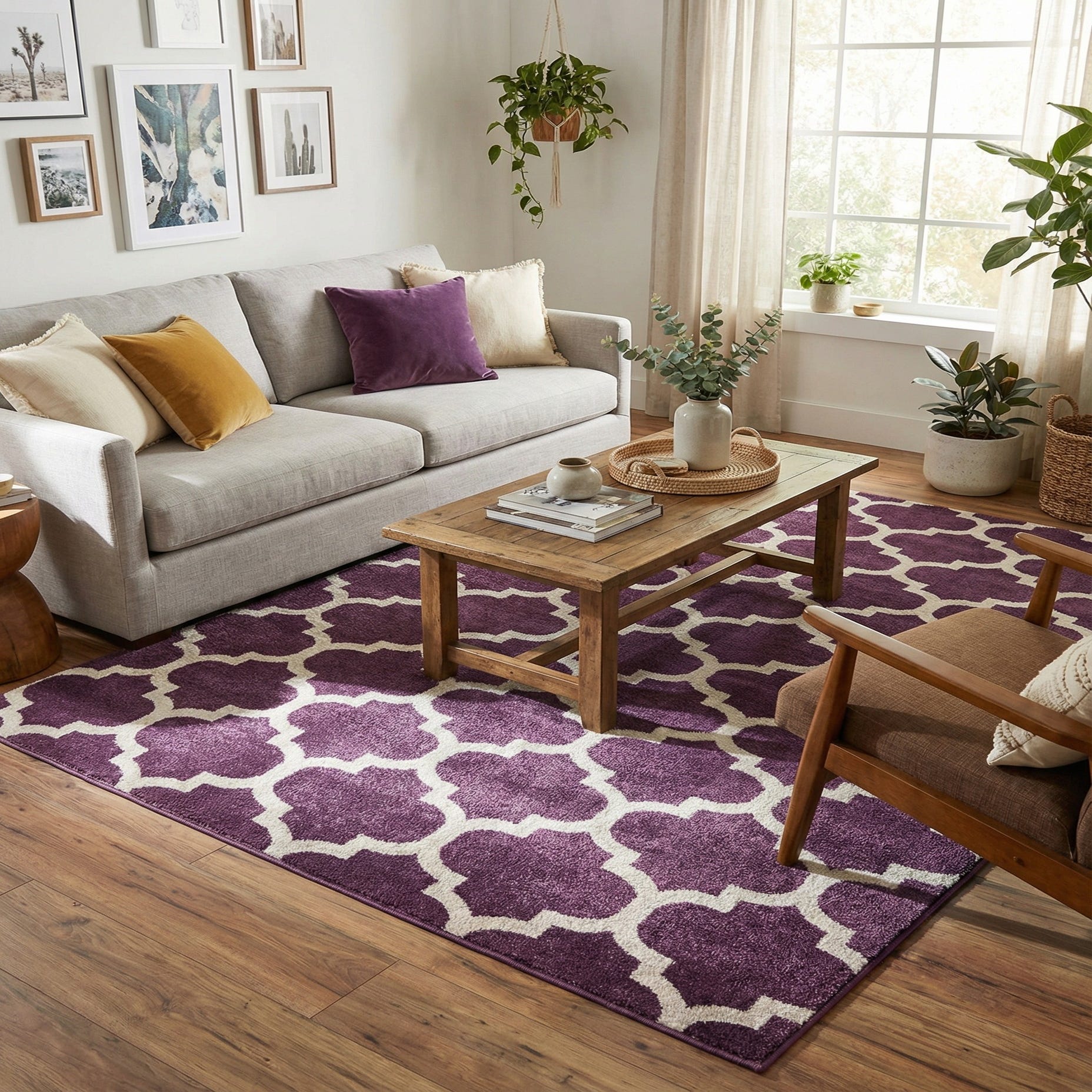 A 7x10 rectangular purple and white modern trellis rug with a medium pile, suitable for a living room.