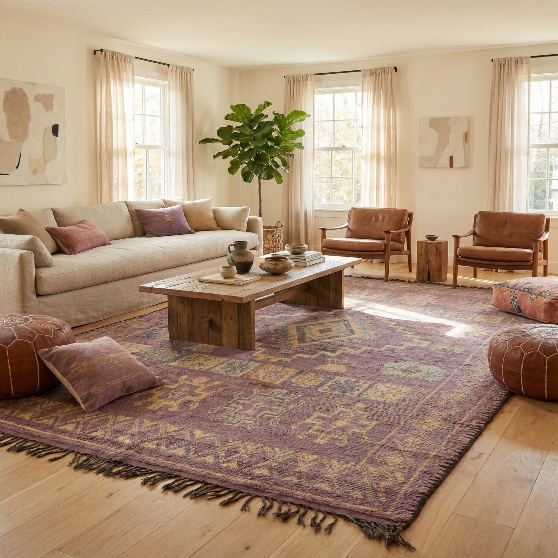 In rooms featuring neutral color schemes, this Moroccan piece can introduce a subtle yet impactful splash of color. For interiors that already incorporate vibrant hues, it can add depth and an additional layer of visual interest. With its robust wool construction, it is equally suitable for private areas such as bedrooms or more public areas like dining rooms, where it can gracefully withstand foot traffic while maintaining its aesthetic appeal.