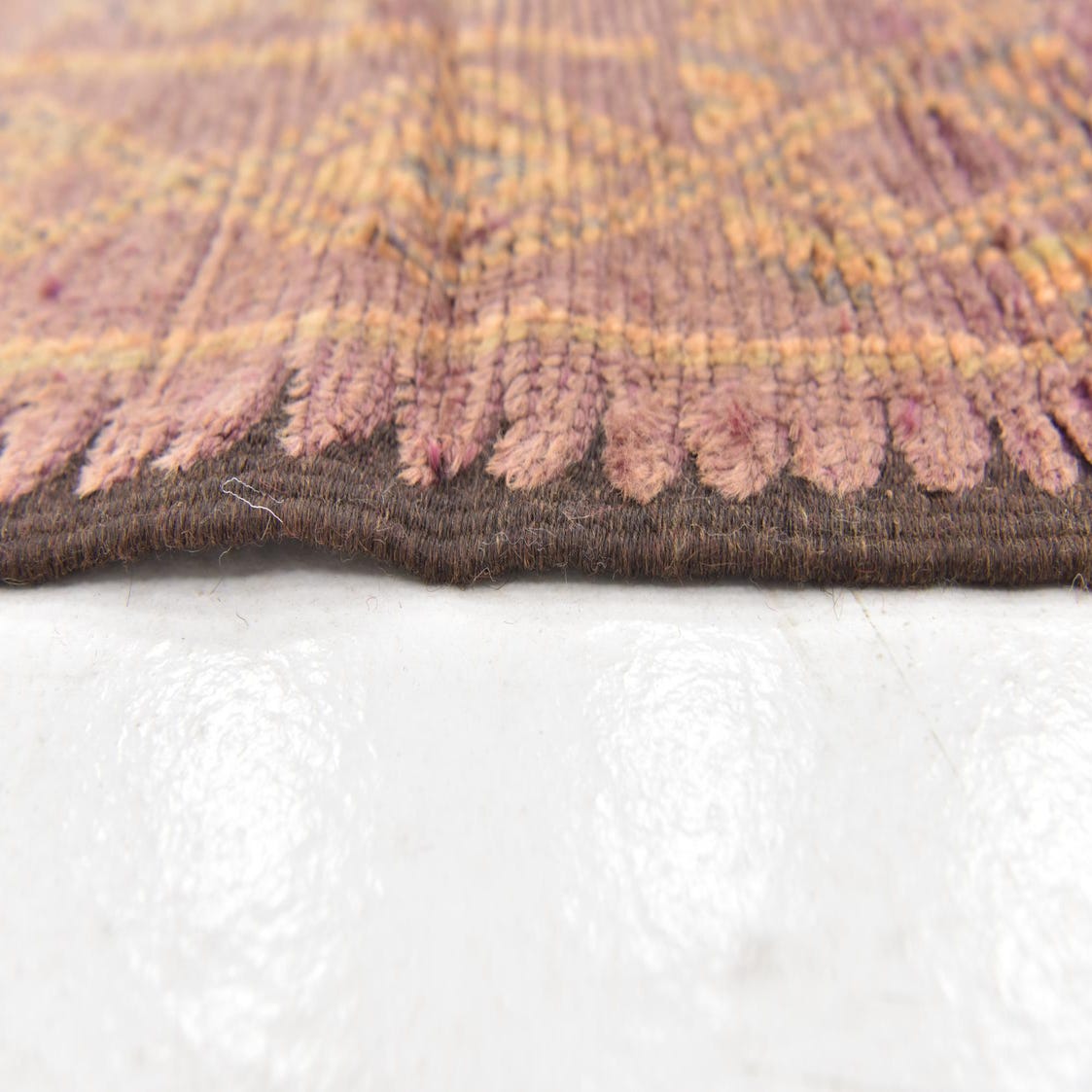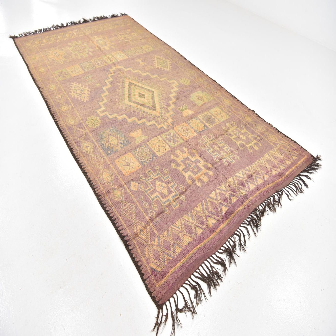 This Moroccan collection rug presents a harmonious blend of purple, gray, and orange hues, set against a predominantly purple background that offers a regal yet inviting ambiance. As a semi-antique piece with 40-60 years of history, it showcases the timeless beauty of hand-knotted craftsmanship in 100% wool. The rug features a distinctive central diamond motif surrounded by an array of geometric shapes and symbolic designs indicative of Moroccan cultural heritage. The low pile affirms its age and adds to its authentic charm, while the presence of fringe on each end accentuates its traditional aesthetic.