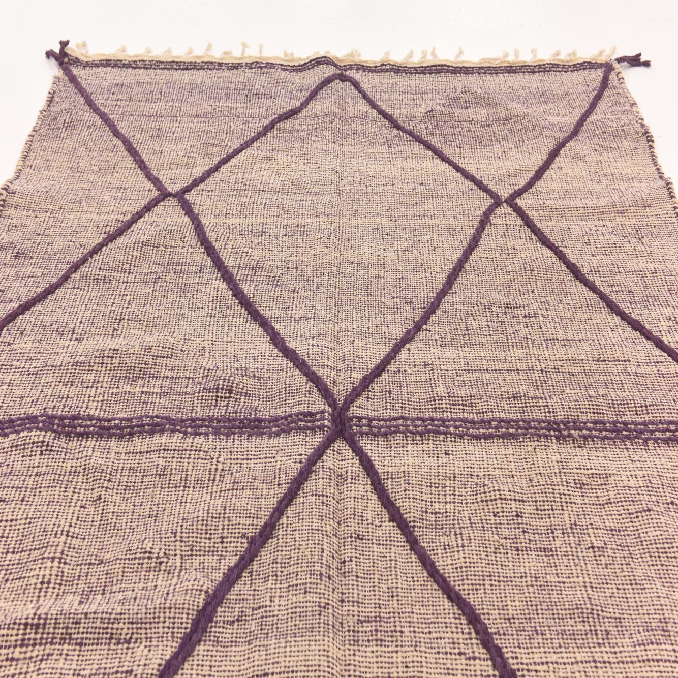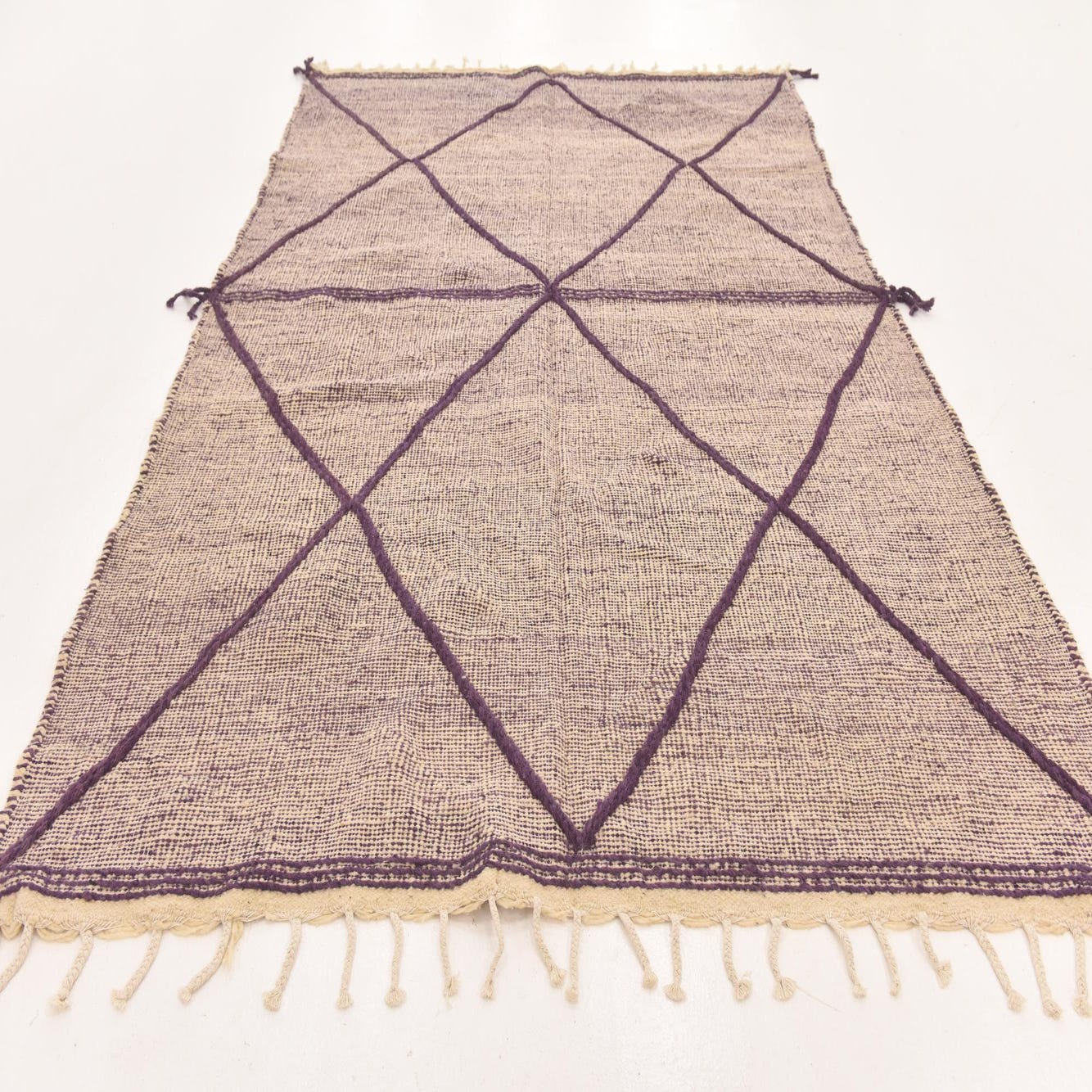 A 7x10 rectangular purple and beige tribal wool rug with a modern diamond pattern and fringe.