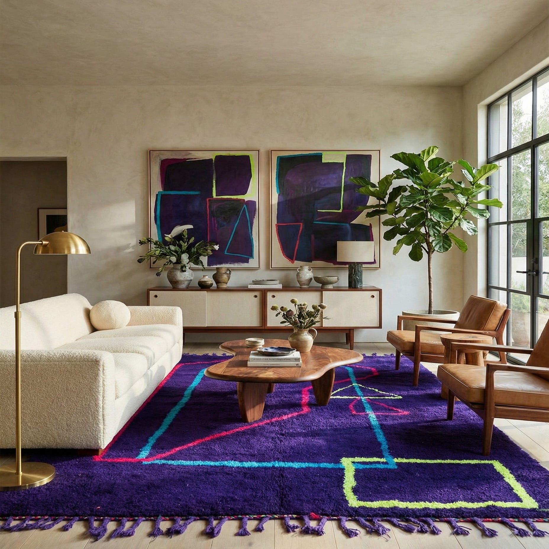This rug would be well-suited to interiors that embrace both traditional and contemporary elements, such as modern bohemian, eclectic, or even minimalist spaces that require a pop of color. It could serve as a focal point in a living room under a coffee table or as an anchor in a dining area, providing both visual impact and timeless artisan craftsmanship.
