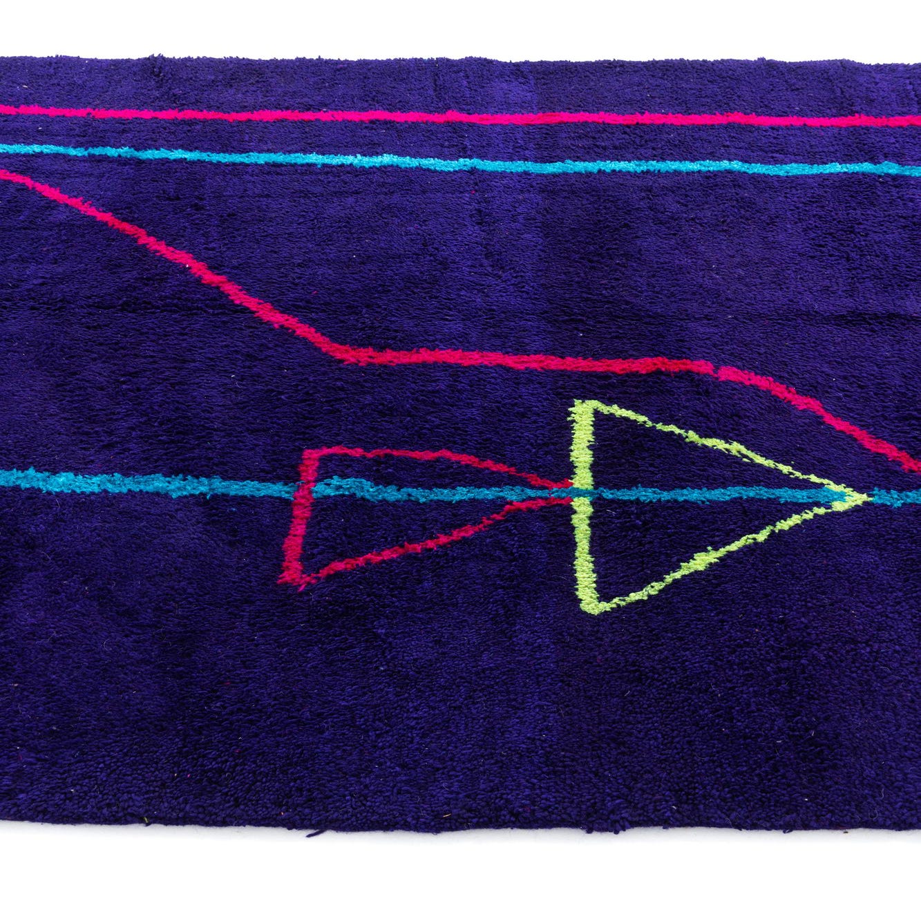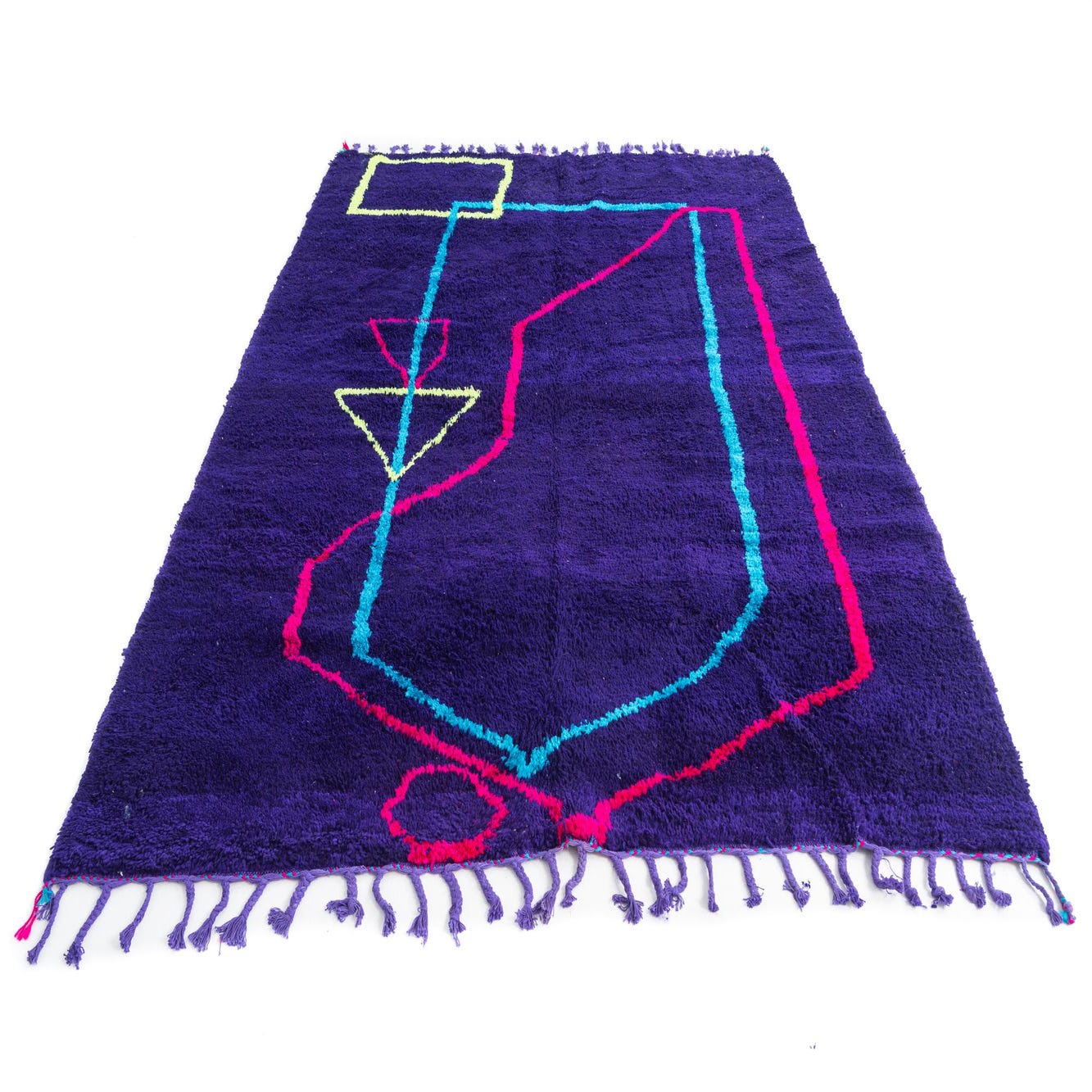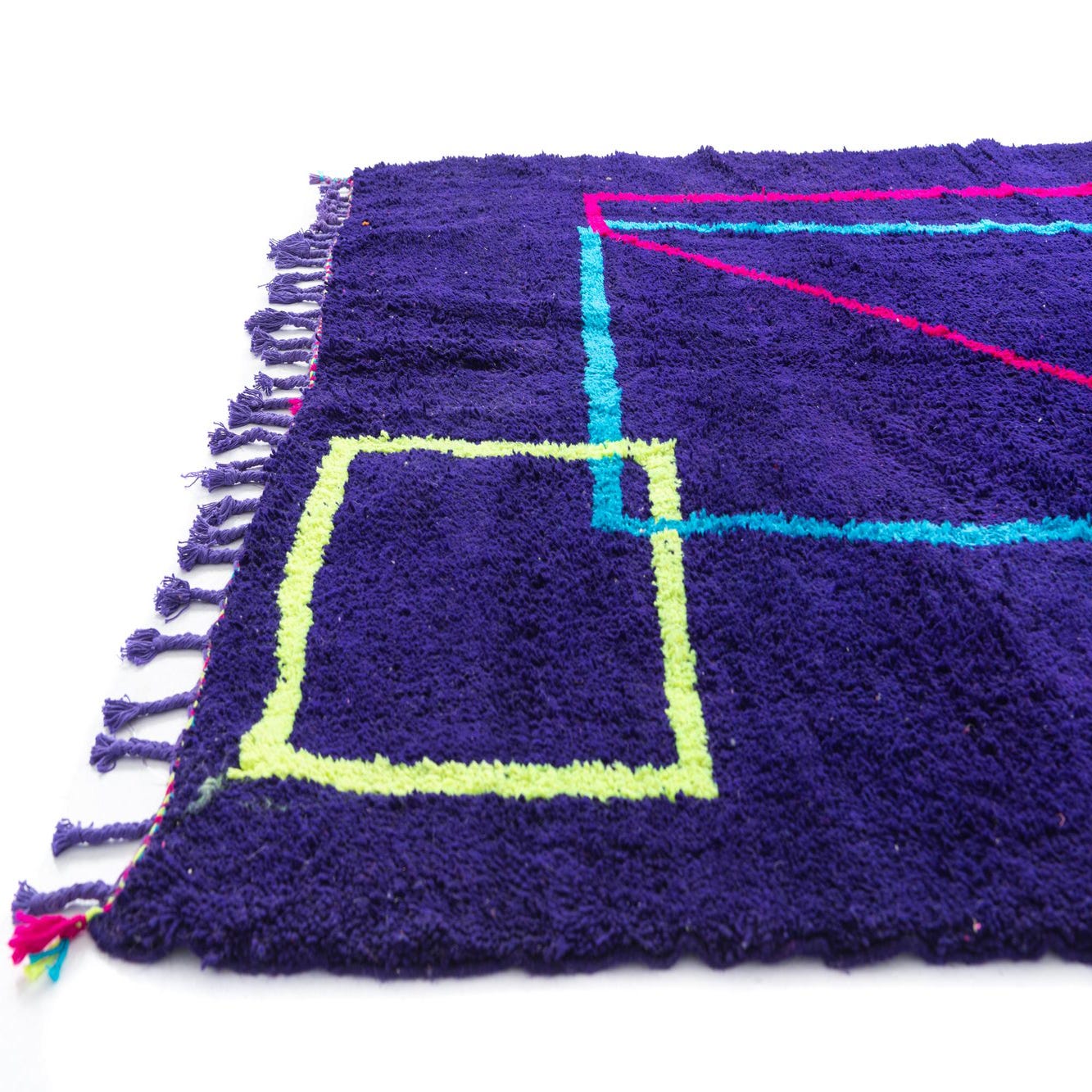 A 7x10 rectangular purple shag rug with a modern tribal abstract pattern in neon green, hot pink, and turquoise lines.