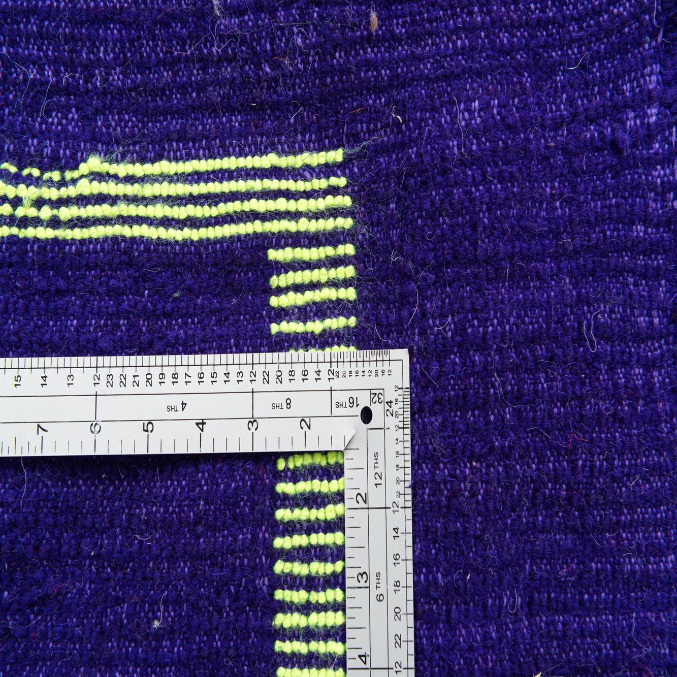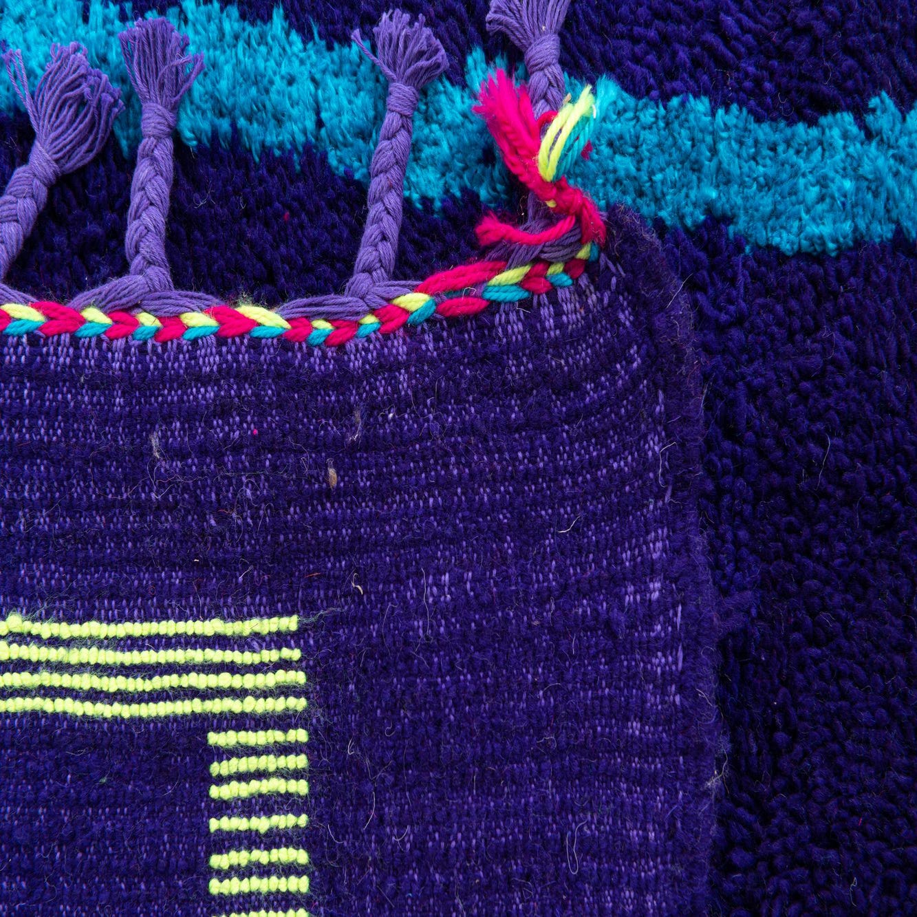 Primary color is Purple. Colors in this rug include: Purple, Blue, Yellow, Pink.
