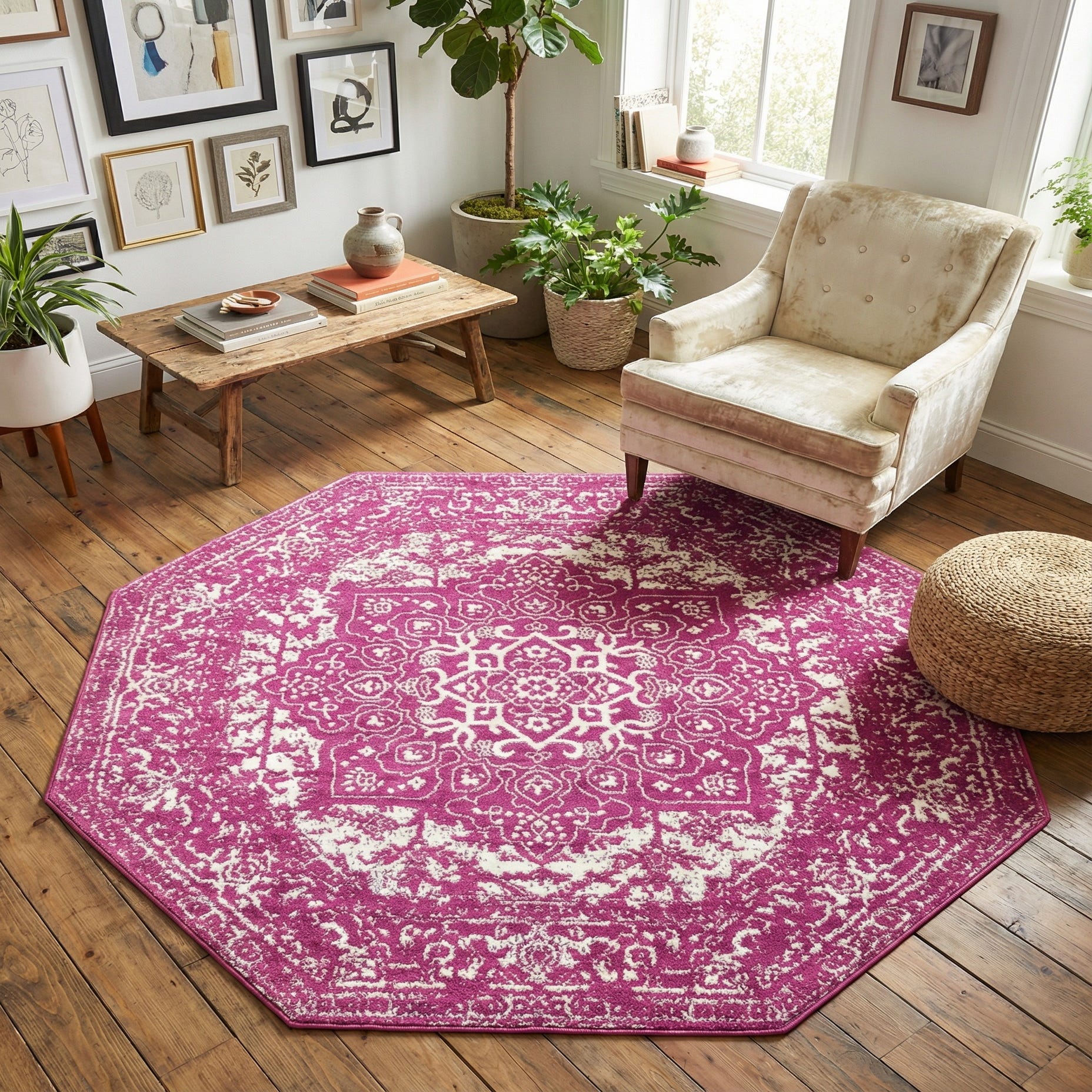 A rich purple field provides a striking backdrop for an ornate ivory medallion and scrolling border. The traditional, Persian-inspired pattern is given a distressed finish that softens the contrast and adds a lived-in character, while the octagonal silhouette gives the piece a distinctive, sculptural look. Intricate floral and geometric motifs sit layered within the central medallion, creating visual interest from every angle.