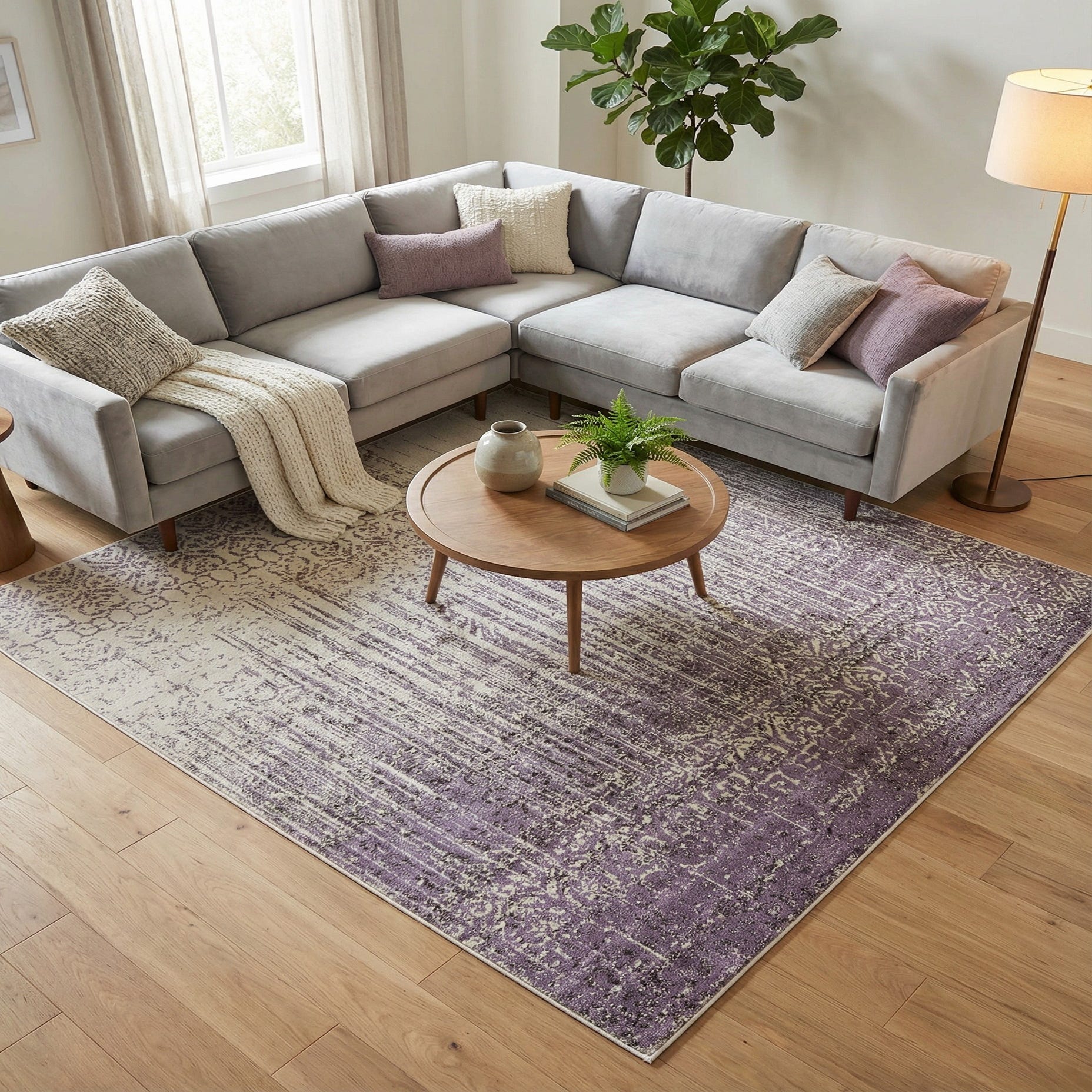 Primary color is Purple. Colors in this rug include: Purple, Ivory, Violet.