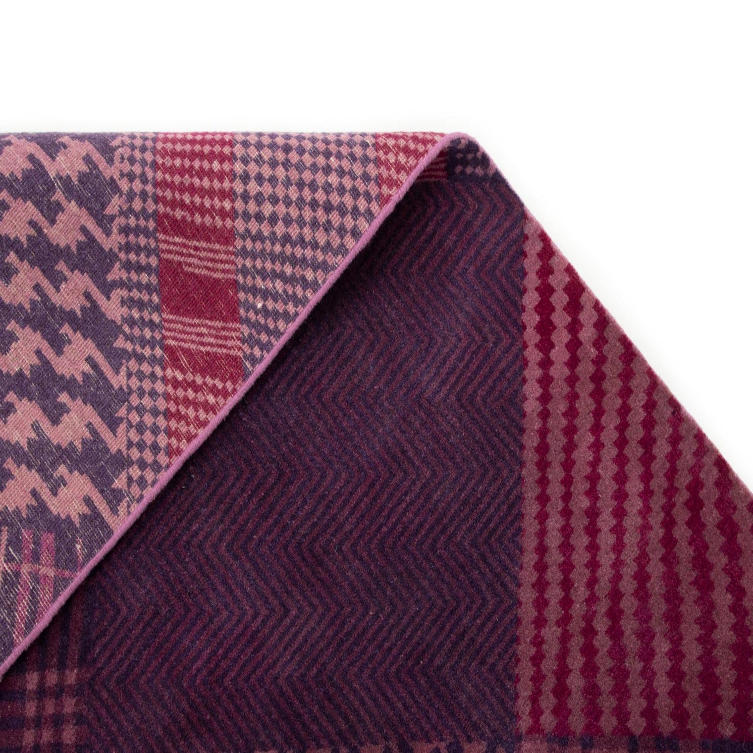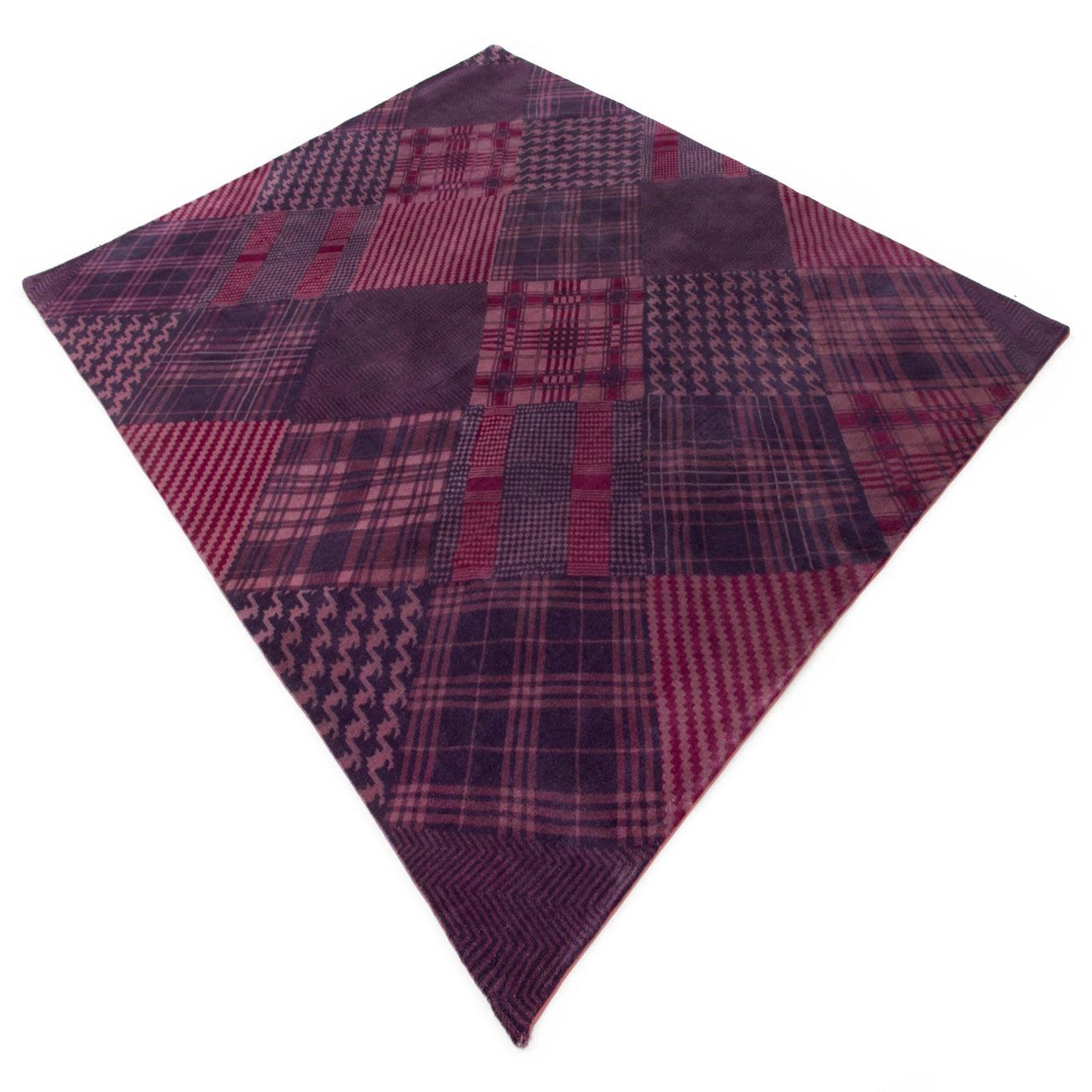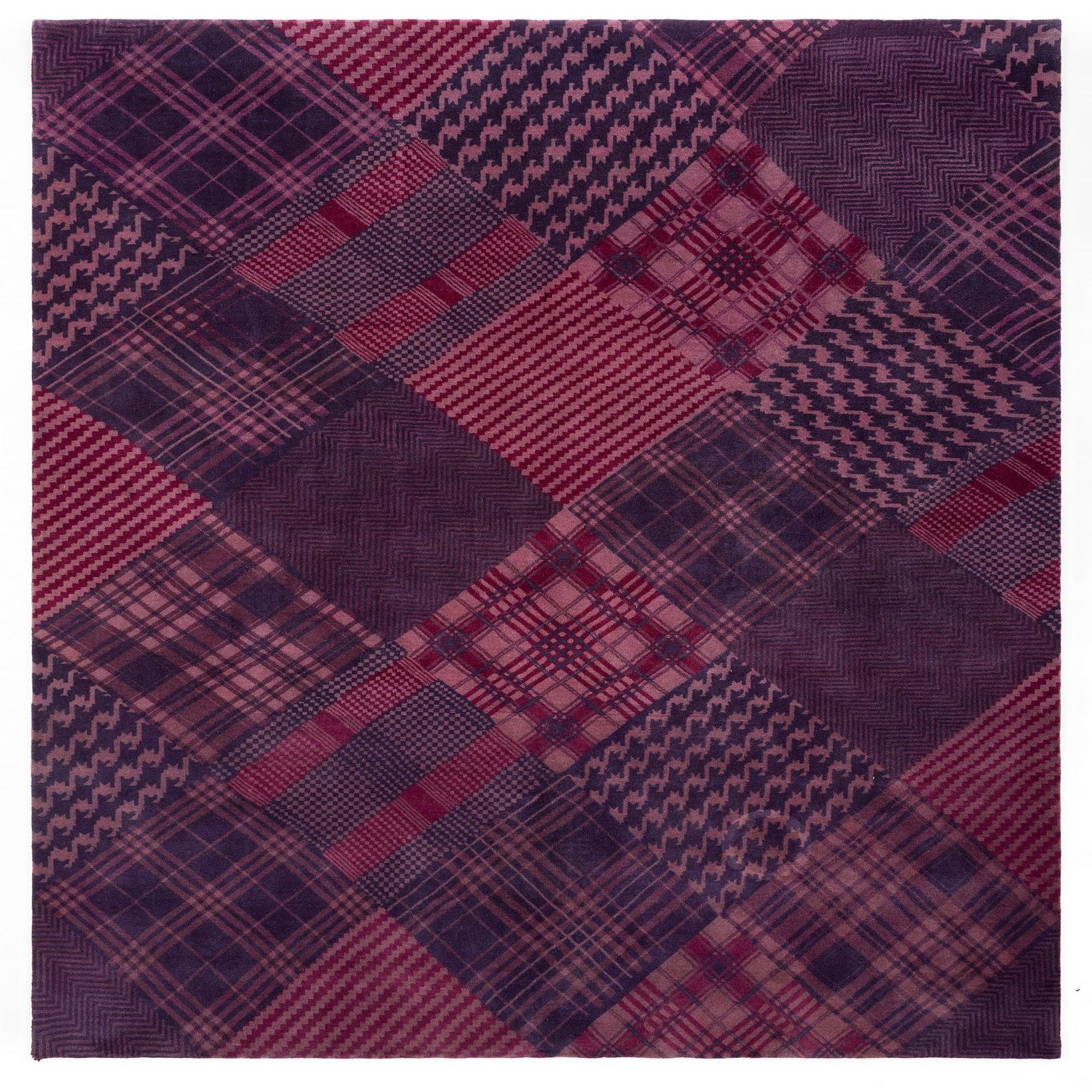 A rectangular 8x10 purple wool rug featuring a modern patchwork of diverse plaid, houndstooth, and striped patterns.