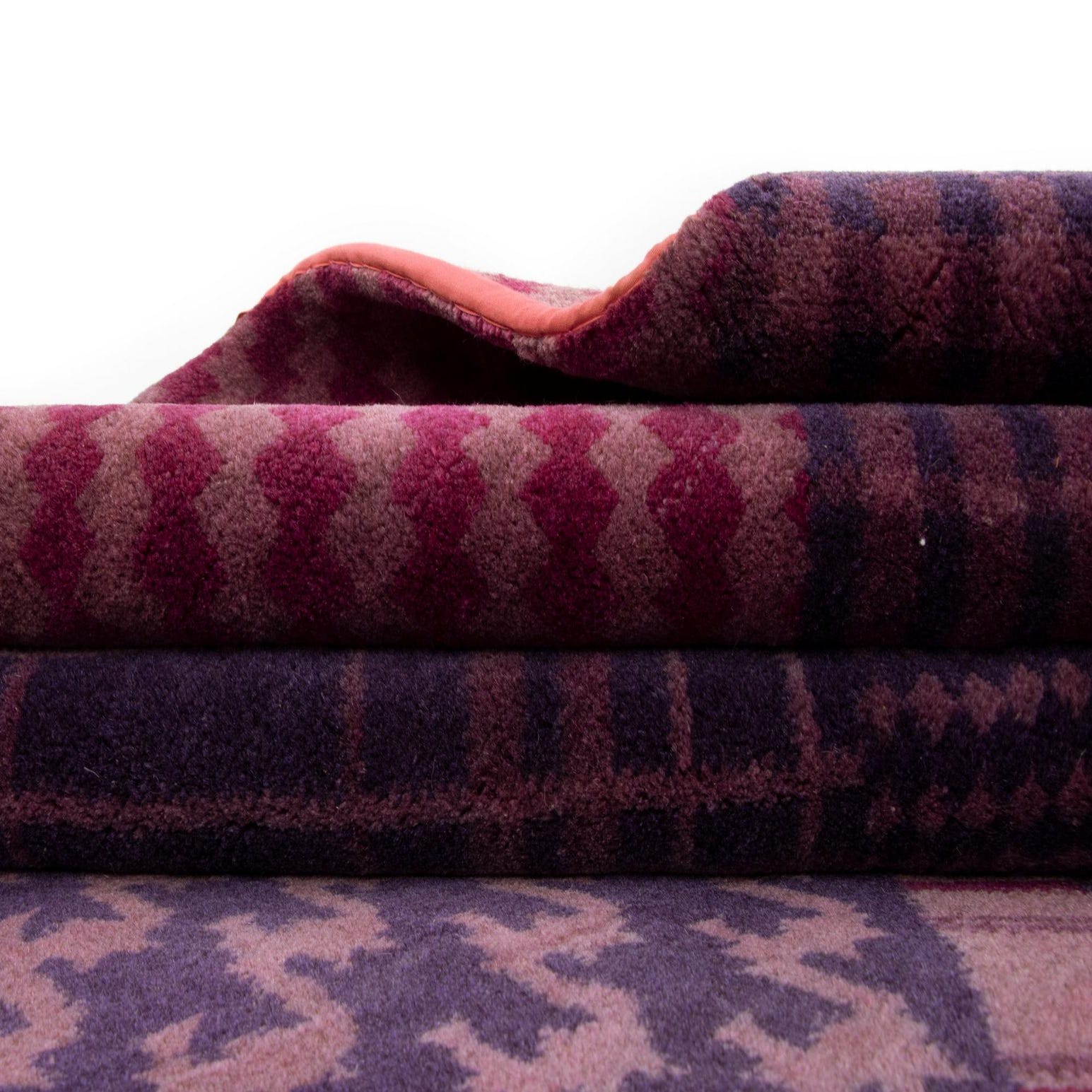 The deep purple background sets a luxurious tone, while the pink accents introduce a playful contrast. The hand-made wool construction ensures a soft, tactile experience underfoot and contributes to the rug's overall durability. The thoughtful assembly of patterns within each panel evokes a sense of traditional craftsmanship with a contemporary twist.