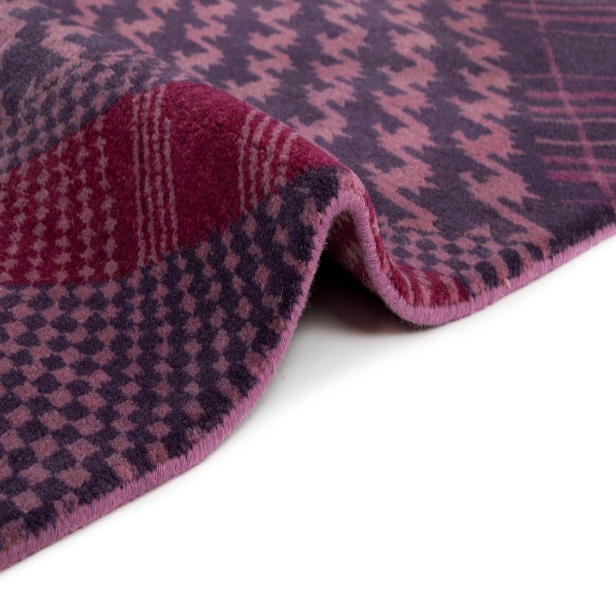 The Modern Manshu collection presents a uniquely patterned 8x10 rug, hand-made with 100% wool, showcasing a dynamic array of purple hues complemented by accents of pink. This rug features a patchwork design, combining various textures and patterns such as houndstooth and plaid. The textural variation and vibrant color scheme create an inviting and warm presence in any space.
