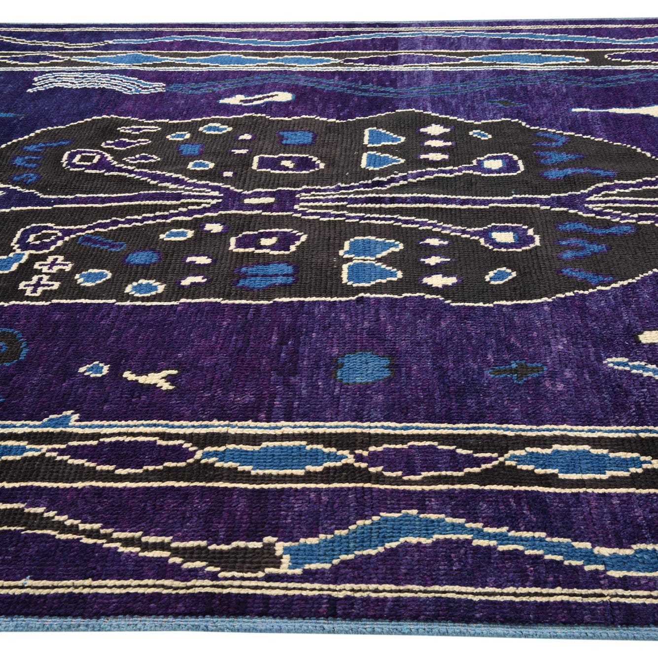 Primary color is Purple. Colors in this rug include: Purple, Black, Ivory, Blue.