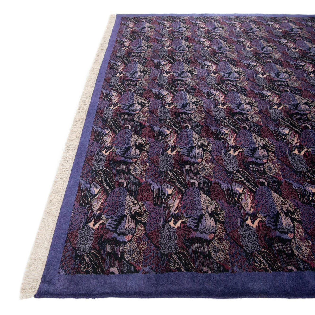 Primary color is Purple. Colors in this rug include: Purple, Black, Violet, Ivory.