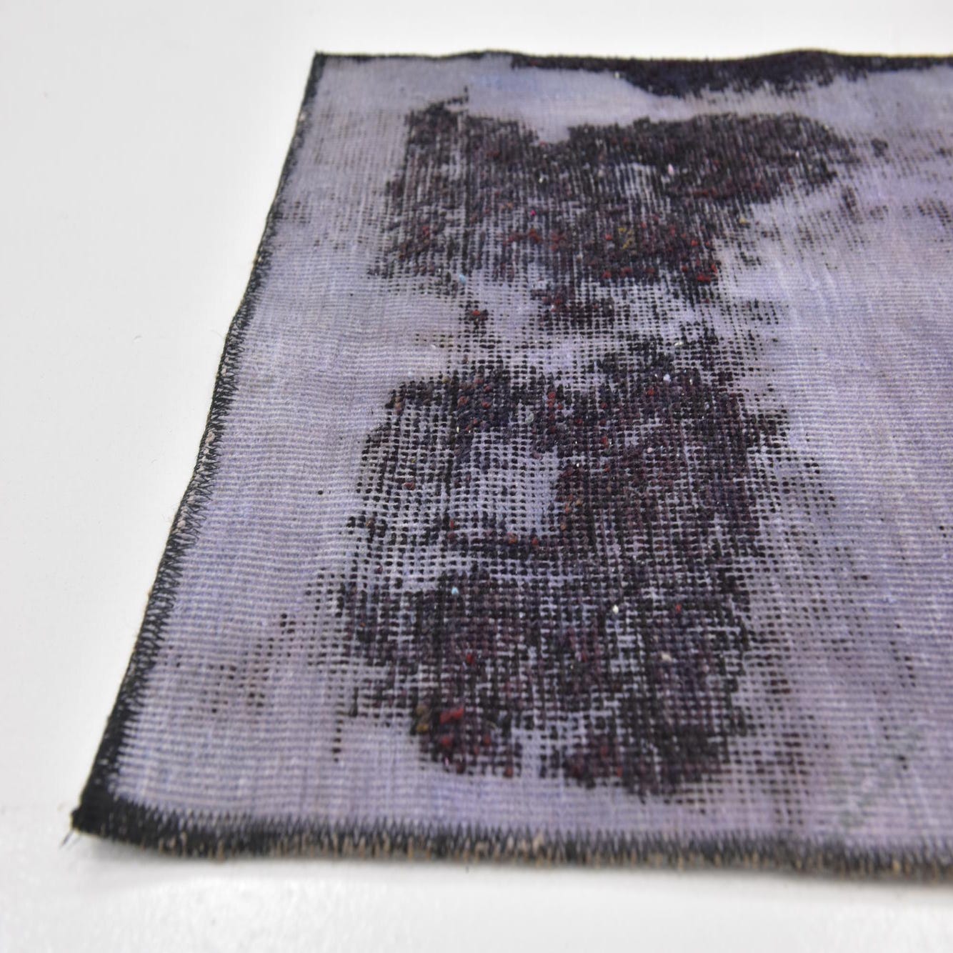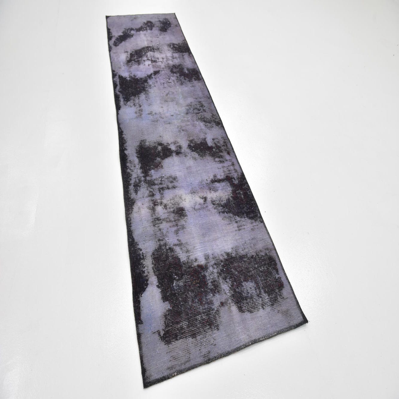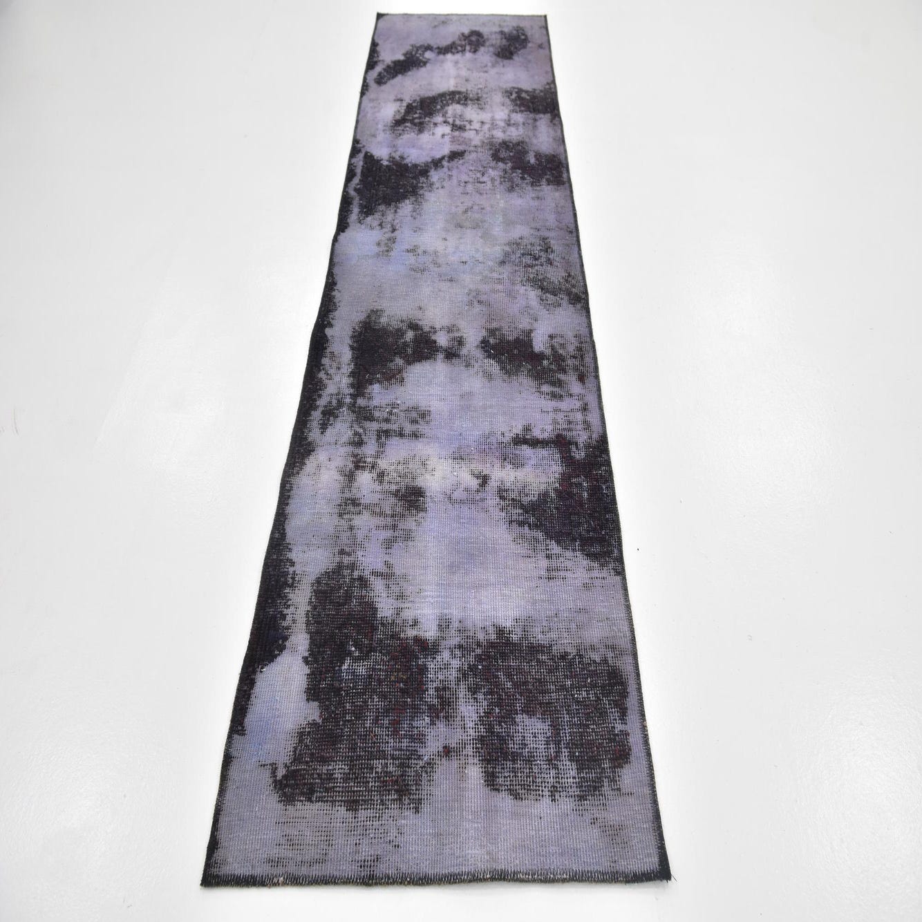 A 9 ft runner rug with a distressed purple and dark gray abstract pattern, suitable for a hallway.