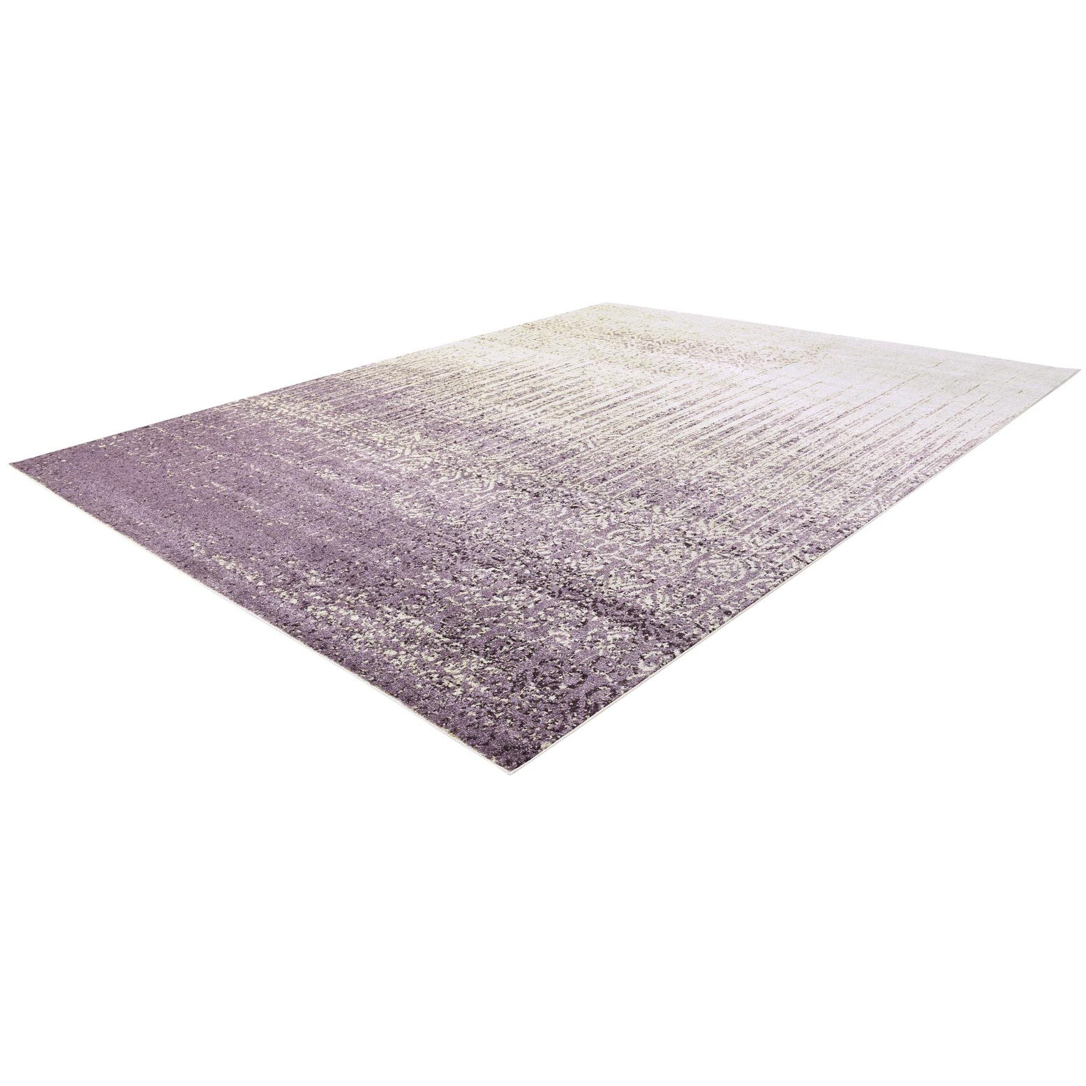 This rug features a rich purple background, accented with contrasting ivory and subtle violet hues. The pattern is a modern interpretation of classic motifs, blending distressed elements with traditional design to create a transitional look. Its texture provides a comfortable underfoot experience while maintaining a low pile height for practicality in high-traffic areas.