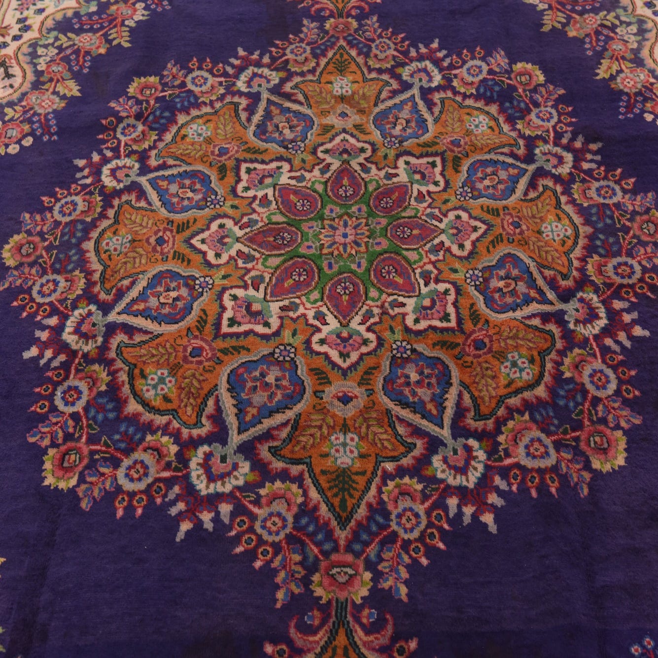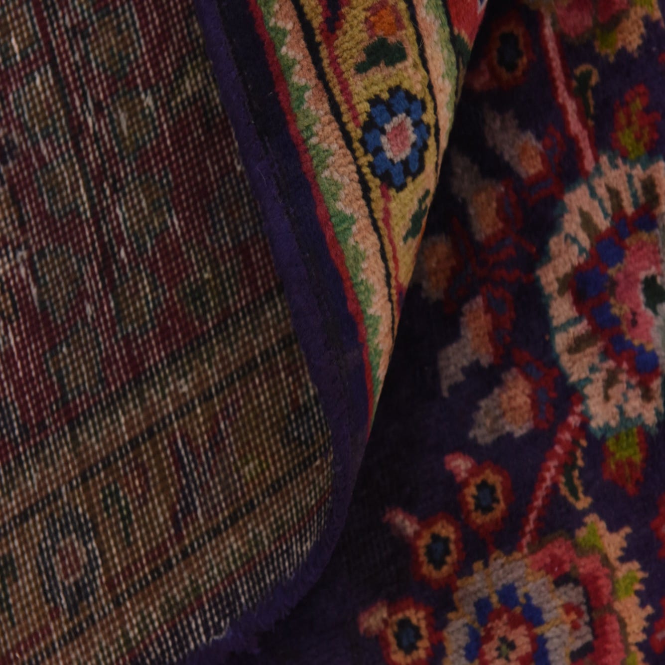 Primary color is Purple. Colors in this rug include: Purple, Black, Blue, Cream, Navy Blue, Red, Olive, Salmon, Pink.