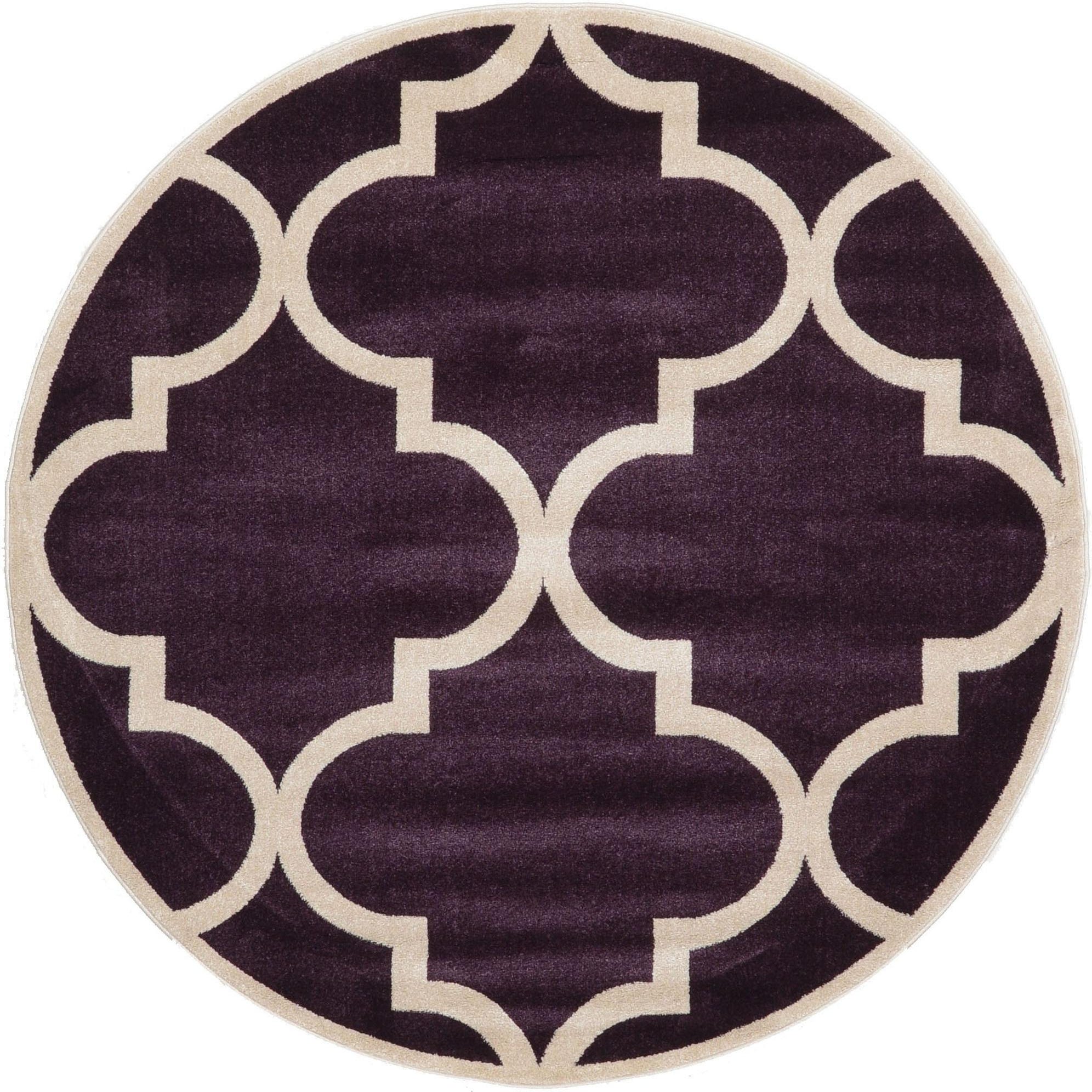 A 6' 0 x 6' 0 round purple rug with a cream modern trellis pattern, suitable for indoor spaces.