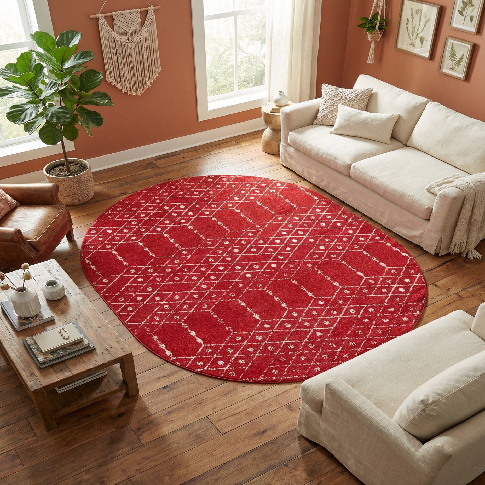 A bold raspberry pink ground sets the stage for a crisp ivory trellis motif that runs across this oval rug. The geometric lattice is punctuated with small dot accents and elongated hex-like shapes, giving the pattern a hand-drawn, slightly worn character that adds depth without overpowering the color. Run your hand along the pile and you'll notice a soft, slightly lustrous surface with a low pile that cushions footsteps while keeping a clean, tailored look.