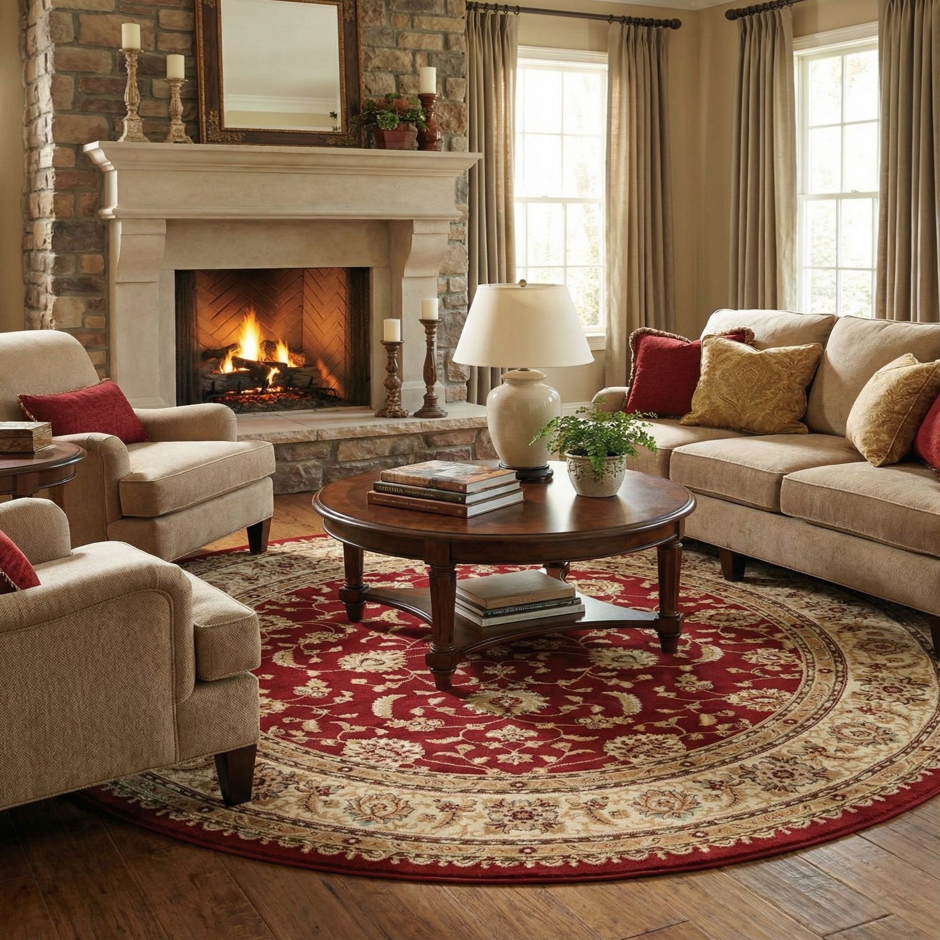 This round shape works well as an anchor beneath a round dining table or to define a seating area in a formal living room or study. The warm red and tan palette pairs naturally with warm wood tones and leather, while the green and light-blue highlights invite coordinating pillows or artwork for a layered effect. Suitable for traditional and transitional interiors, it can also introduce classic pattern and color into more contemporary spaces that need a focused focal point.