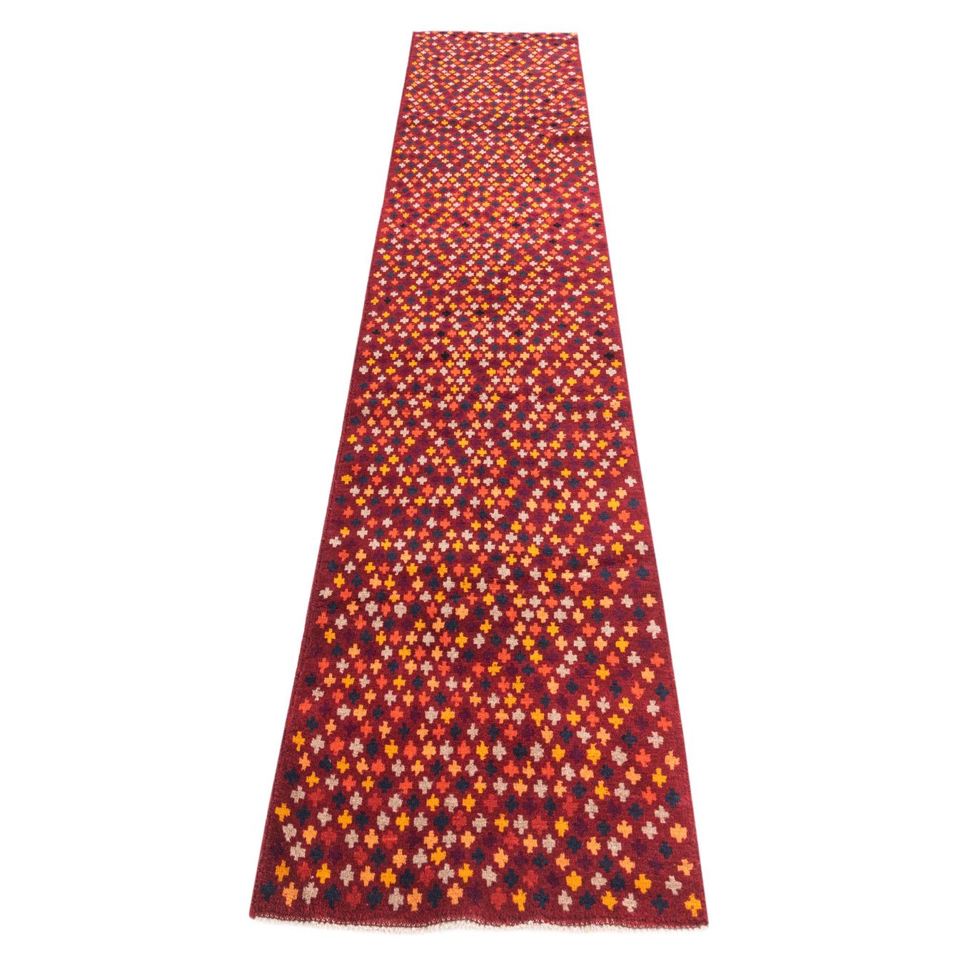 A 10 Ft Balouch runner rug in deep red with a repeating pattern of small tribal motifs in orange, yellow, black, and beige.