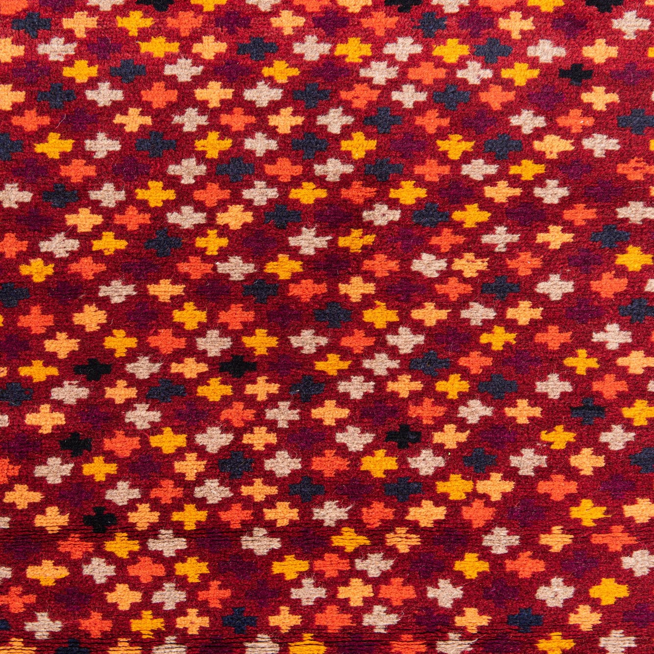 This Balouch collection rug is a hand-knotted 10-foot runner crafted from 100% wool, offering a durable and tactile surface underfoot. The piece exhibits a vibrant red background, enriched with a traditional repeating pattern that features an array of contrasting tones including black, orange, yellow, and ivory. The design of this runner is characterized by a series of geometric motifs that offer visual interest and cultural authenticity.
