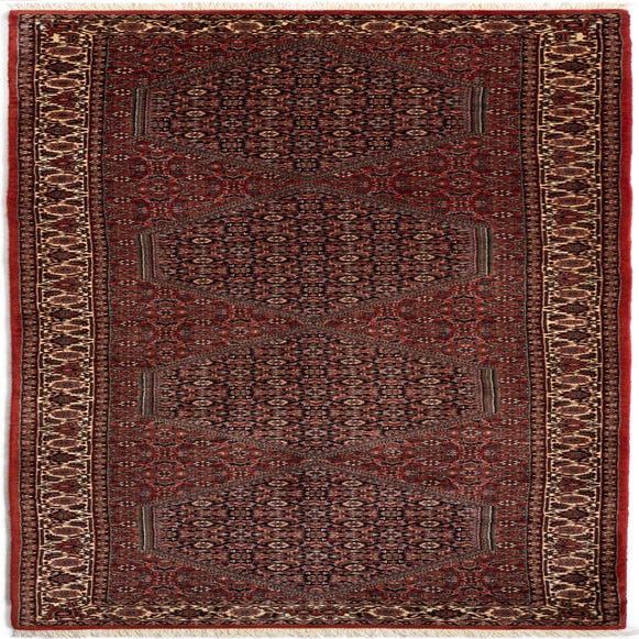 The stylized botanical motifs and borders draw from classic Persian rug artistry, characterized by repeating elements and diamond medallions that create a sense of balance and harmony. The rug's edges are defined by multiple borders that add a layer of complexity and visual interest to the overall design.