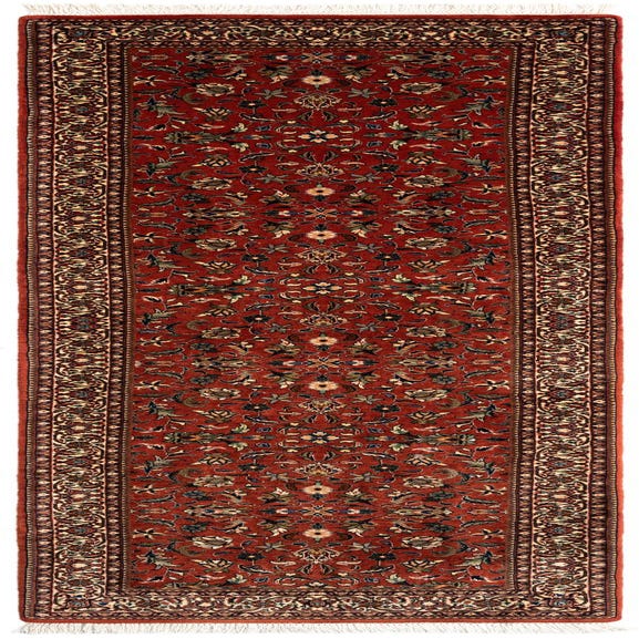 Primary color is Red. Colors in this rug include: Red, Red, Cream, Black, Blue, Brown, Green.