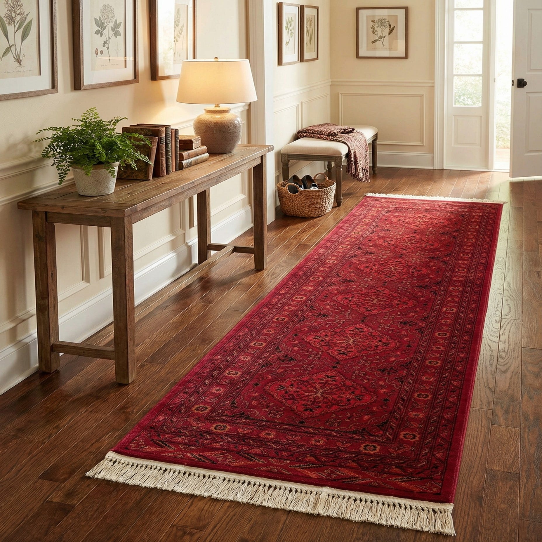 This rug is incredible! I love the look and quality of vintage rugs but have an elderly pet and a child in the home so that just wasn’t in the cards for us. This rug is the perfect substitute! I’ve been looking for a large rug for the living room but didn’t want to commit to such a big purchase without getting a good look at it first. Ordering this runner seemed like a great way to test it out beforehand. And I’m sold. I plan to purchase the largest size for our new living room in a couple months and use this runner in the adjacent kitchen.It arrived rolled. It had a very faint dye scent at first that dissipated within about 2 hours. The fringe is really cute. I may consider tea-dying the fringe eventually to darken the ivory a bit (We will have dark oak floors in the new house and I don’t love high-contrast fringe). I ordered the less expensive of the two rug pads at checkout and it’s perfect for a runner because it’s thin. For a larger rug in a living space I’d go for the thicker pad. Can’t recommend this highly enough!