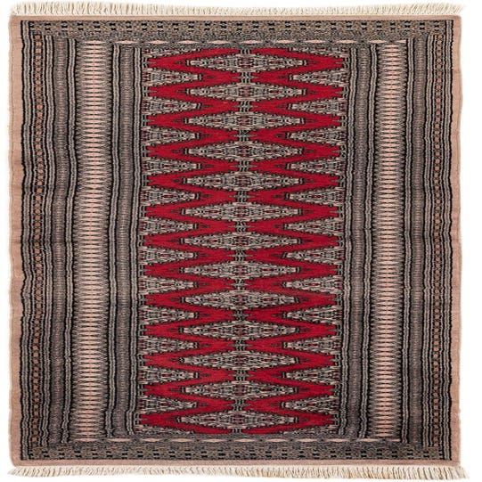 Primary color is Red. Colors in this rug include: Red, Black, Ivory, Pink.